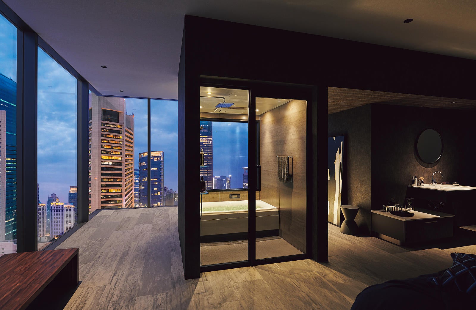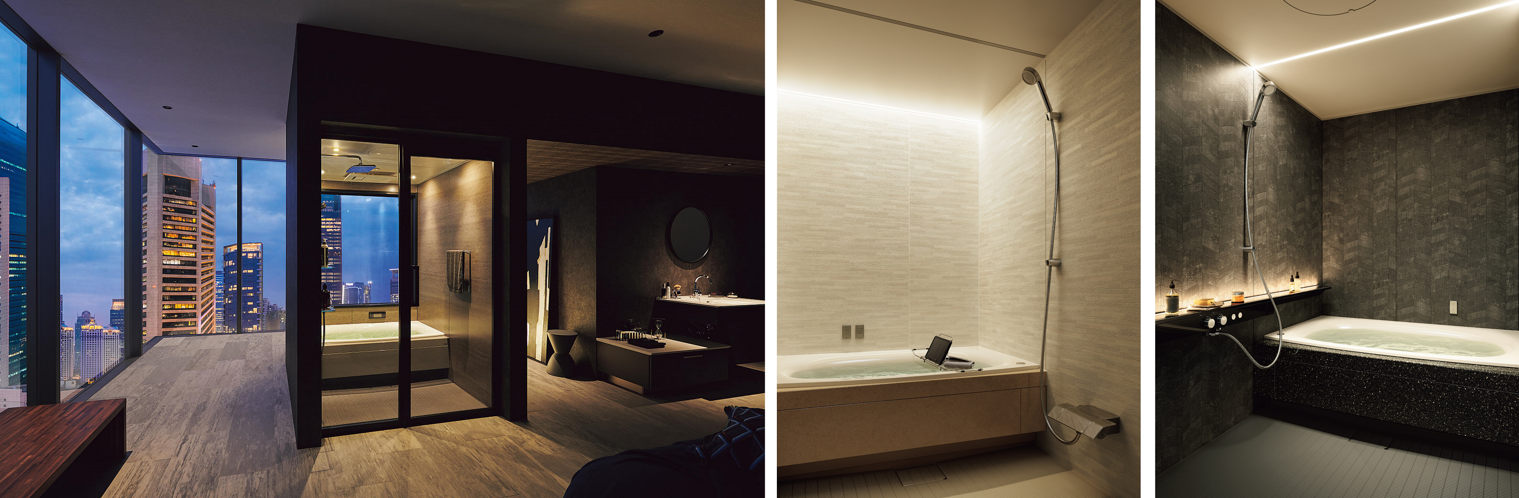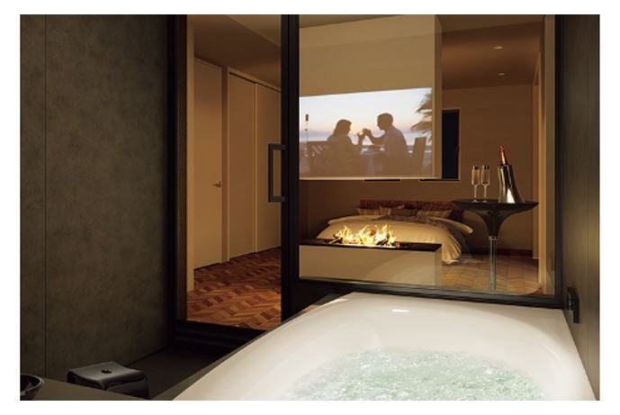 浴槽フチまでの大きな「FIX窓」で隣り合うお部屋と浴室をつなぎ、湯船につかりながら映画を鑑賞できる贅沢な空間を実現