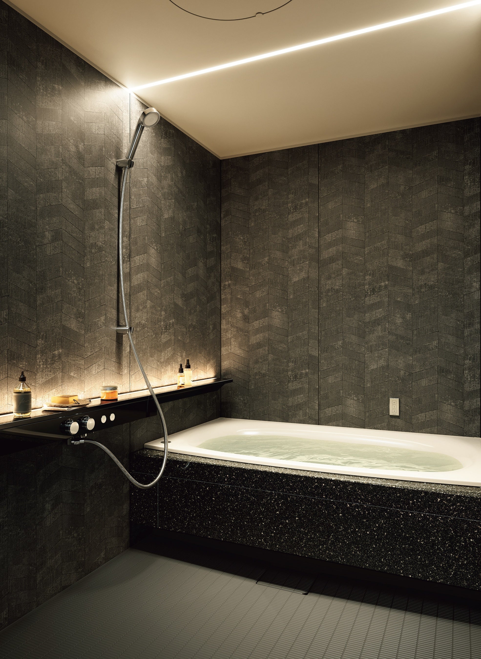 「Lクラス」だけのダブルカウンターやマウント浴槽で仕様を充実させ、壁は戸建て用の別シリーズ「オフローラ」の「アイスラックブラウン柄」を選択。つややかな高級ホテルのような仕上がりを実現します。