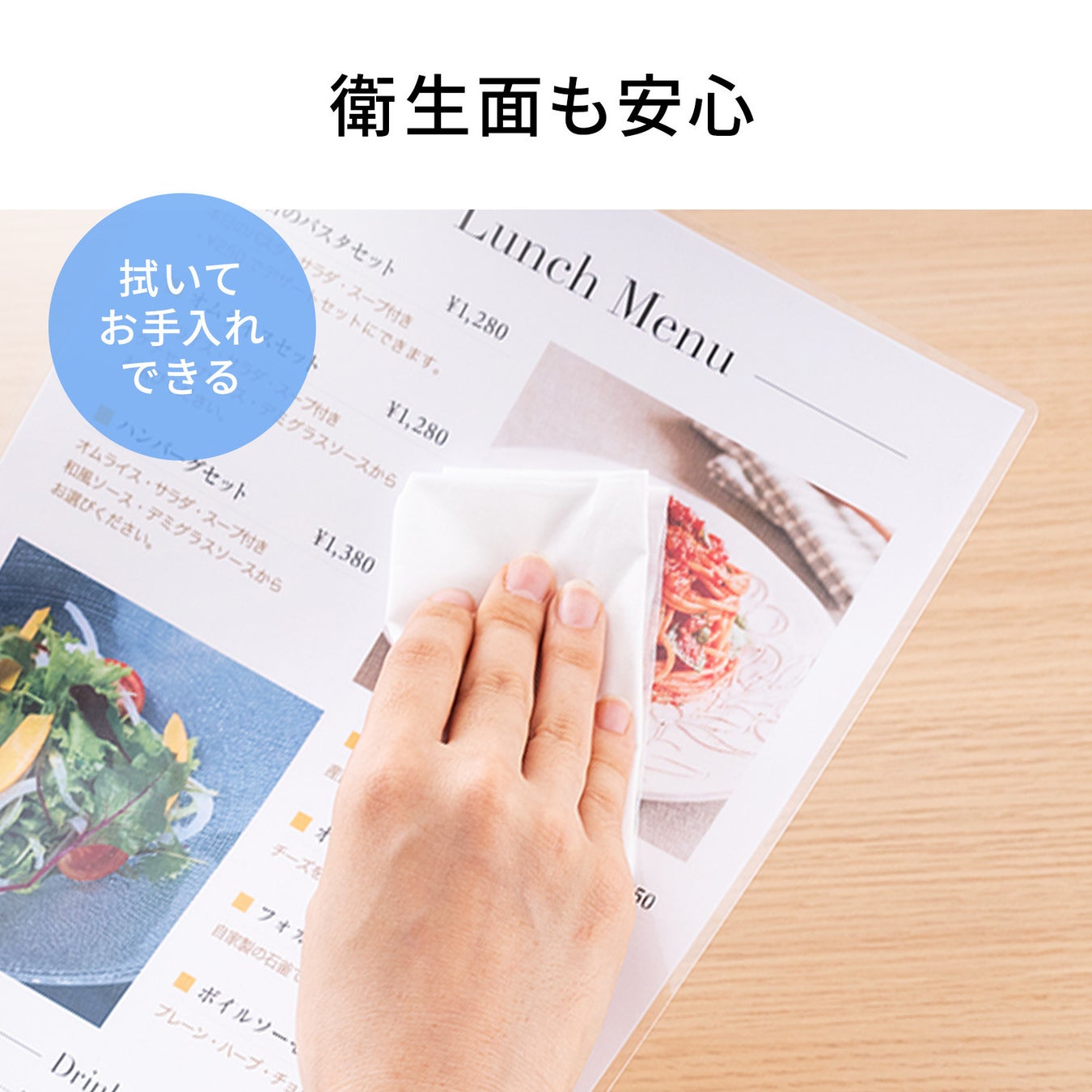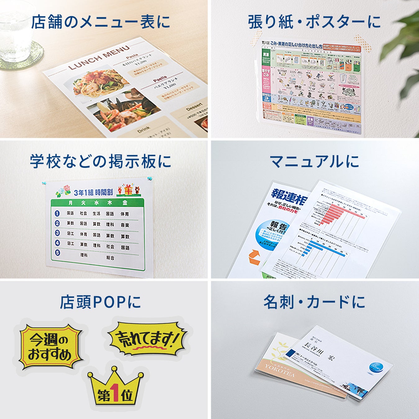 店舗・施設の案内表示や、学校・オフィスの掲示物、メニューや店頭POPにも使用できます。
