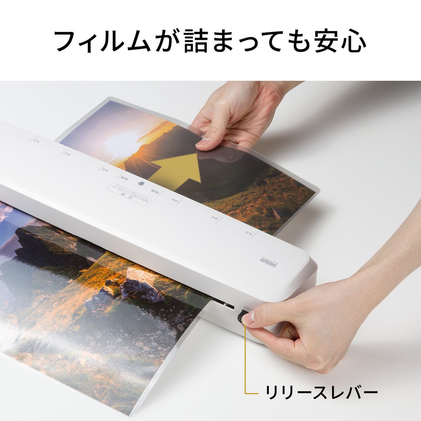 ラミネートフィルムが詰まった場合は、リリースレバーを押しながらフィルムを引き出すことで取り除けます。