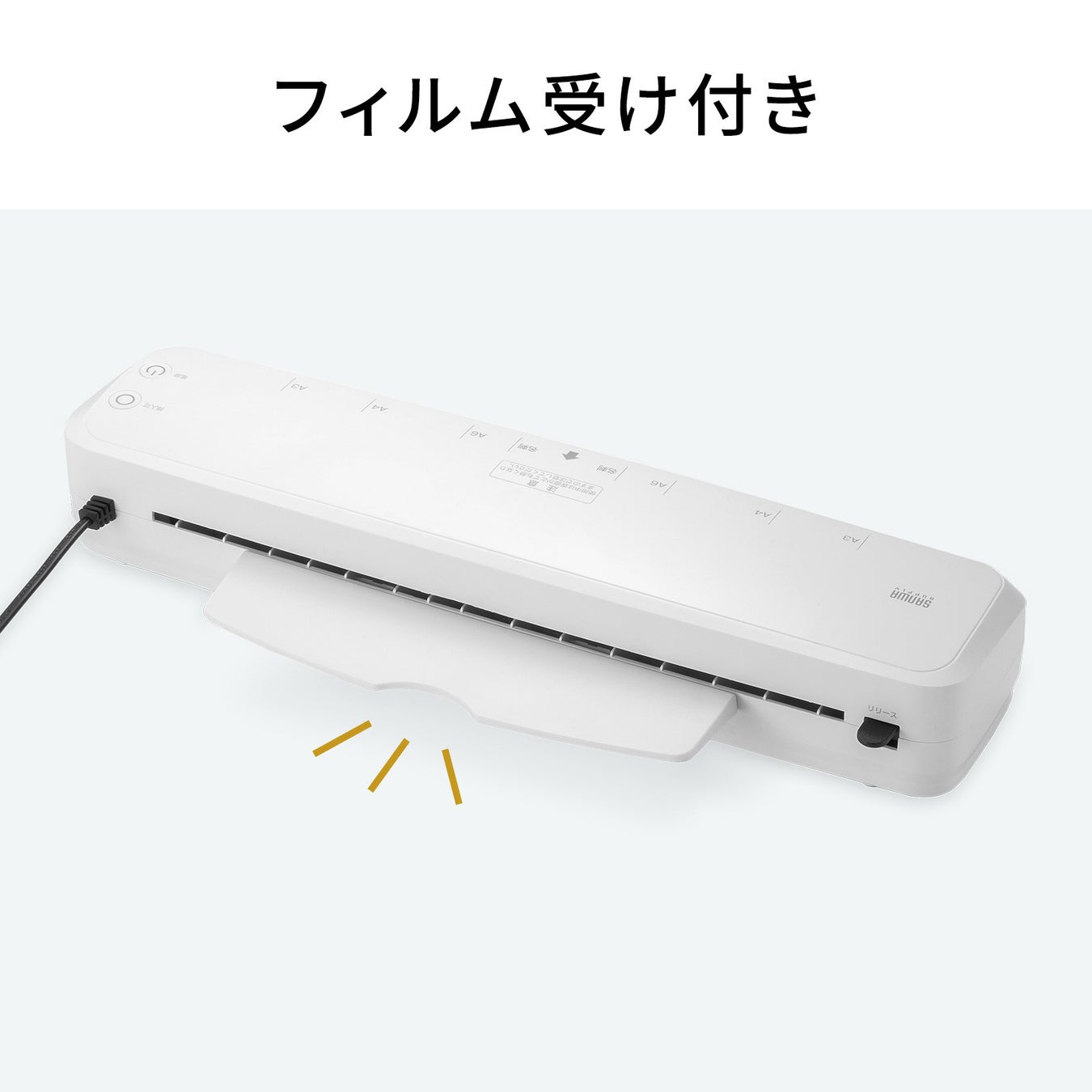 フィルム受け付きで、ラミネート後の熱いフィルムを冷ますことができます。