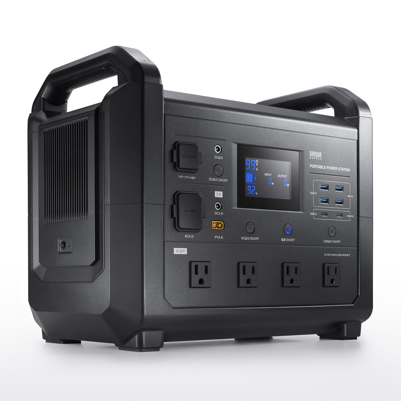家庭用コンセント(最大1500W)と同等以上の最大1600WまでAC出力が可能な高出力モデル。