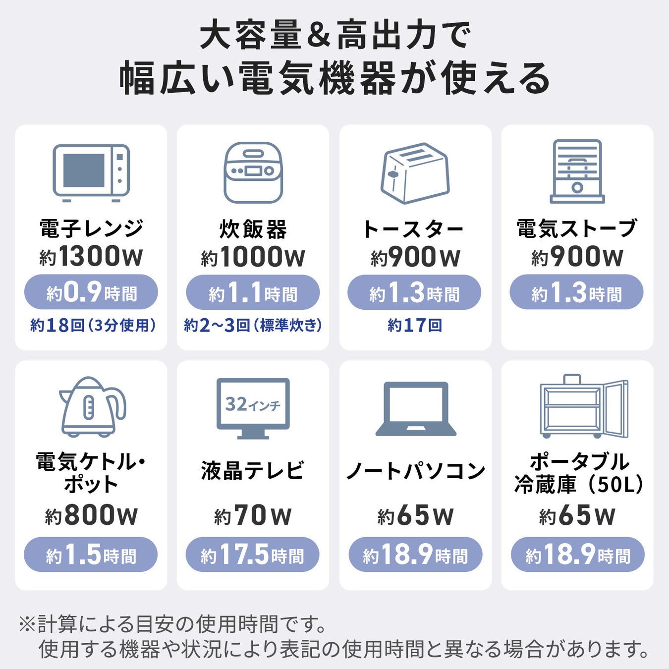 大容量&高出力で、幅広い電気機器が使える