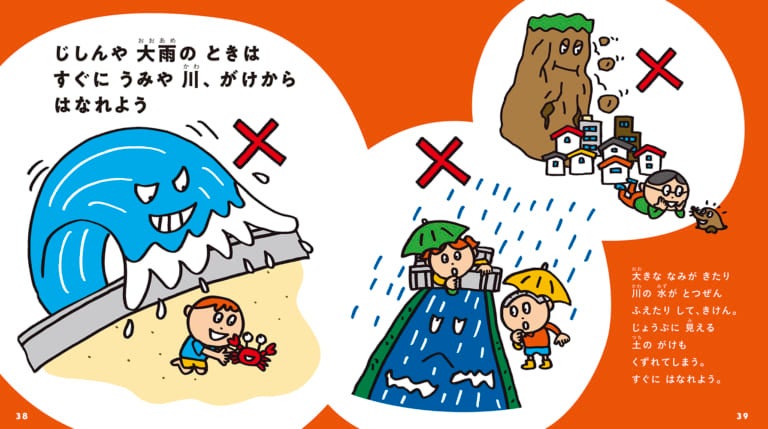 地震だけでなく、近年ひんぱんに発生する記録的大雨や台風などの災害が起きたときに、子どもたちはどのように命を守ればいいのか――そんな大事なことを簡潔に、やさしいイラストで教える絵本が『ぼうさい』です。
