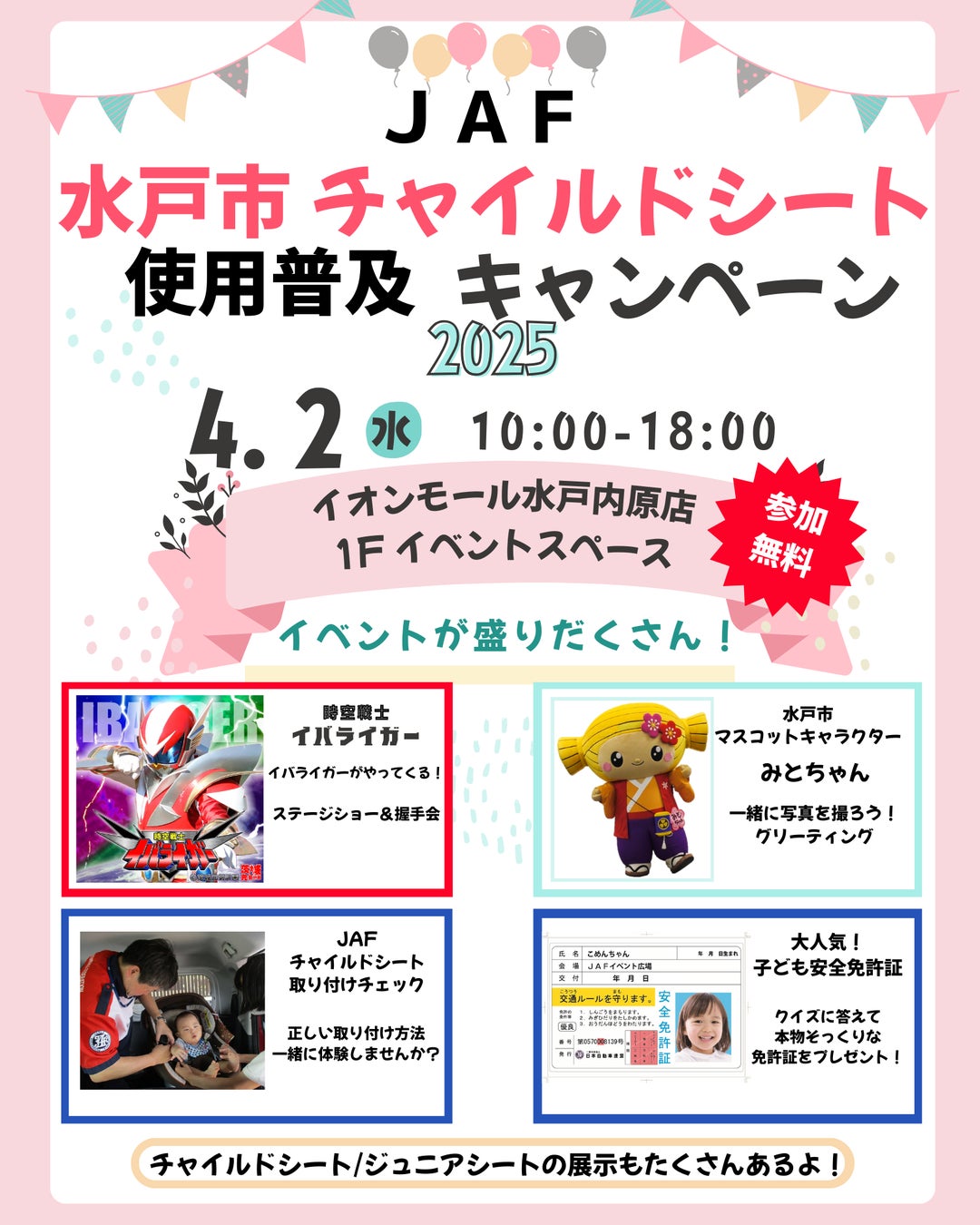 一般社団法人日本自動車連盟(JAF)茨城支部(支部長・幡谷 史朗)は、4月2日(水)にイオンモール水戸内原1階メインコート(茨城県水戸市)にて、主催3団体(JAF、科学警察研究所、公益財団法人交通事故総合分析センター)など計10団体・企業が協力して、「水戸市 チャイルドシート使用普及キャンペーン 2025」を開催します。