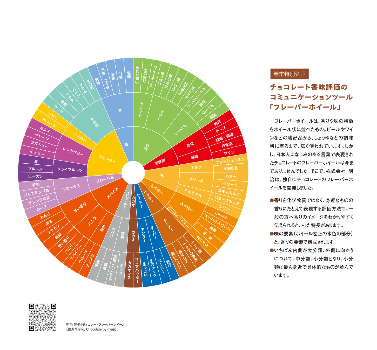 巻頭特集では、児童労働問題への対応や、森林減少抑制など、昨今のカカオ産業を取り巻く課題についてもくわしく解説。さらに、巻末には、チョコレートのテイスティング時の香味表現に役立つ「チョコレートフレーバーホイール」を収録しました。