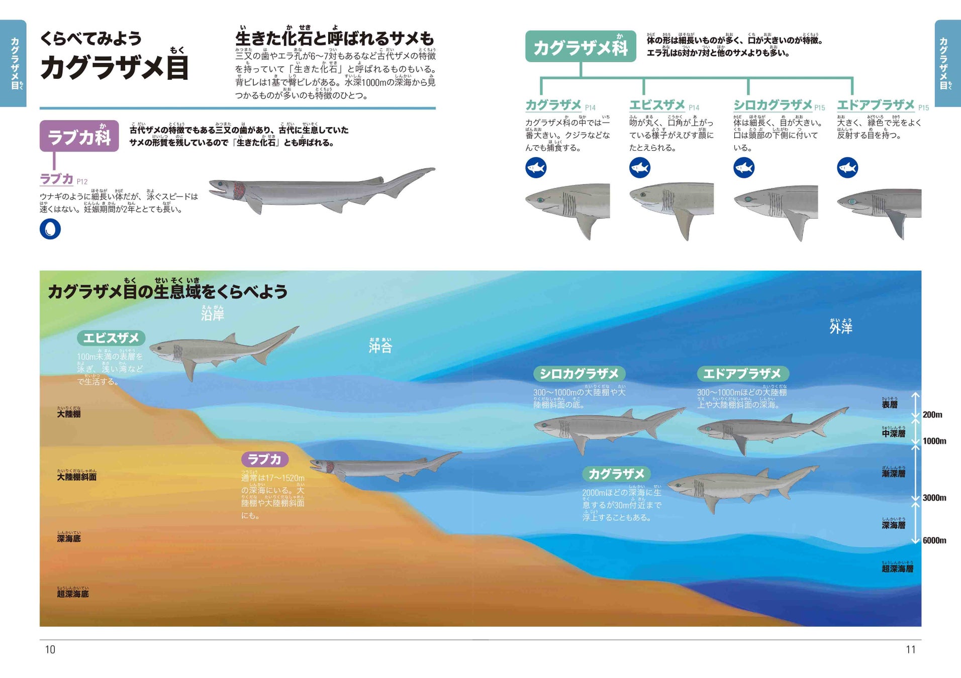 本図鑑にはサメたちが浅瀬から深海までどこに棲んでいるかがくらべてわかる「生息域をくらべよう」のページ付き。また、「カグラザメ目」「ラブカ科」などサメたちの分類についてもわかりやすく解説したので、はじめてのサメ図鑑としても最適です。