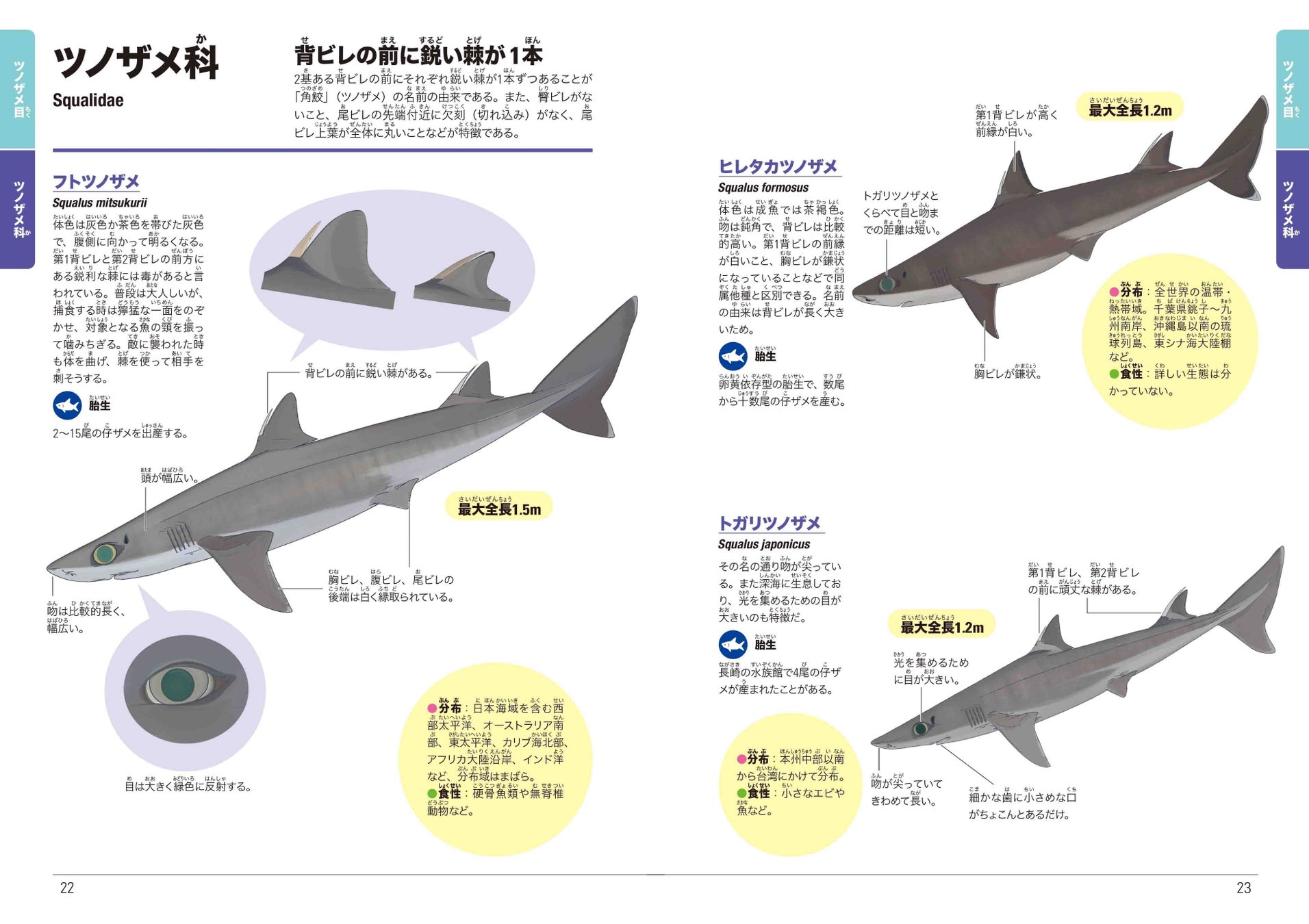 掲載しているサメの種数はなんと150。「背ビレの大きさが違う」「目と吻までの距離が近い」などイラストに識別点が入っていて違いが見くらべやすいのはもちろん、「妊娠期間が2年」「ほぼ全身に発光器を持ち、光る」「ドリル型の卵を産む」など、おどろきの生態もそれぞれの種の解説で詳しく紹介しました。