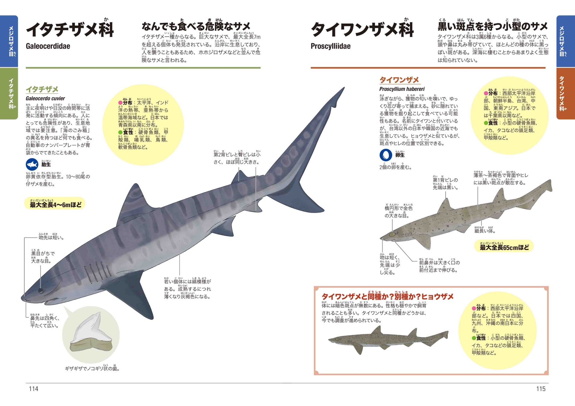 似たサメの違いがイラストでよくわかる! ヒレや歯、体型、模様の違いなど色々くらべてみよう。 『くらべてわかるサメ』刊行