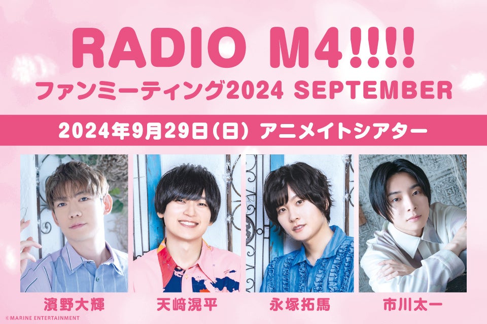 濱野大輝さん・天﨑滉平さん・永塚拓馬さん・市川太一さんの4人が、最近あったできごとや興味のあることについて他愛もない話をしたり、後先考えずに全力で企画に挑んでいるラジオ番組『RADIO M4!!!!』。2024年9月29日(日)にアニメイトシアターで開催する同番組のファンミーティング関連情報をお届けします。