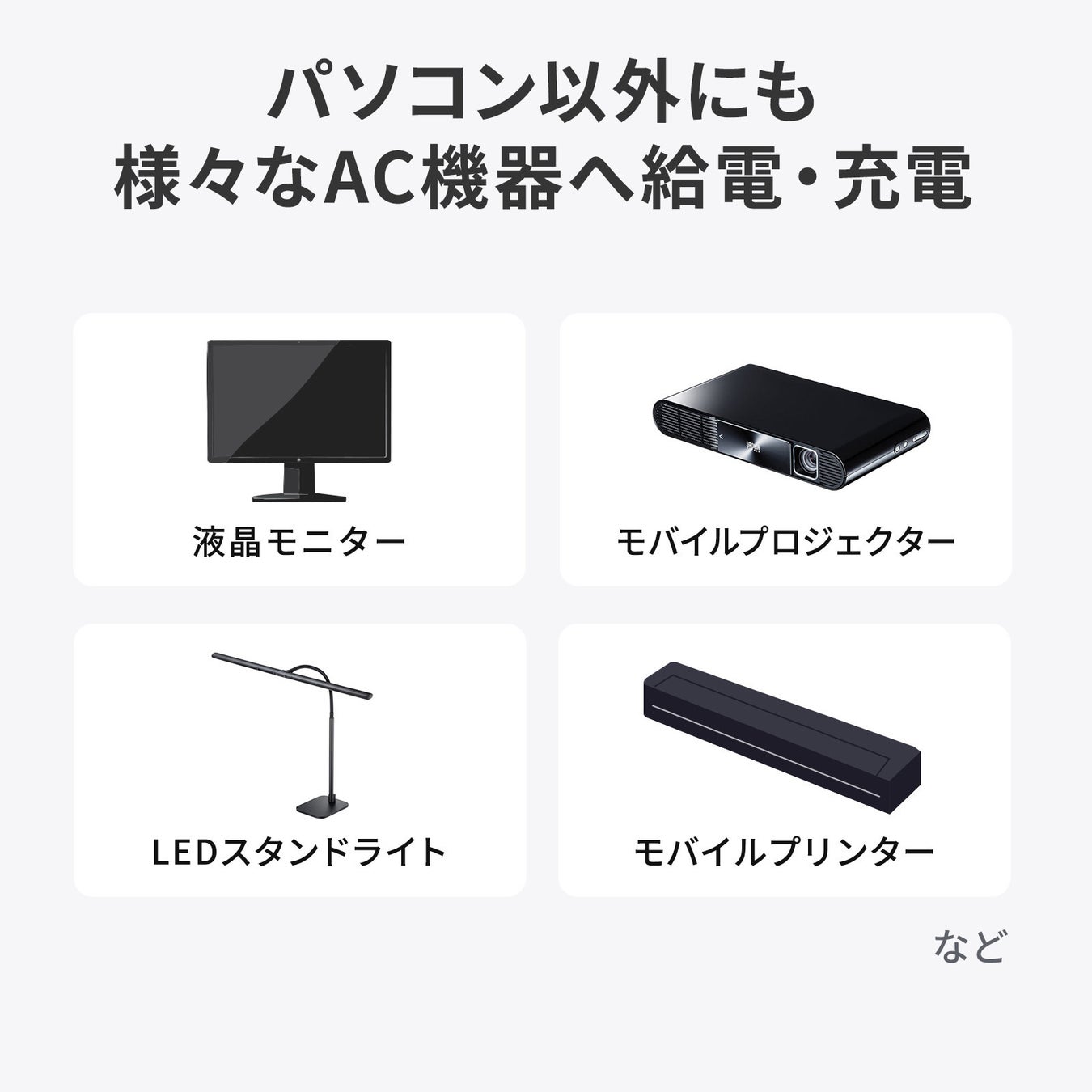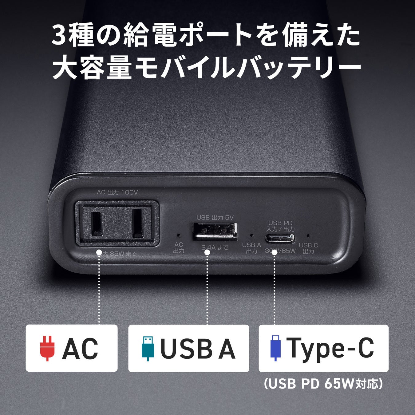 AC×1、USB A×1、Type-C×1と3種の給電ポートを搭載しており、様々な機器に対応します。
