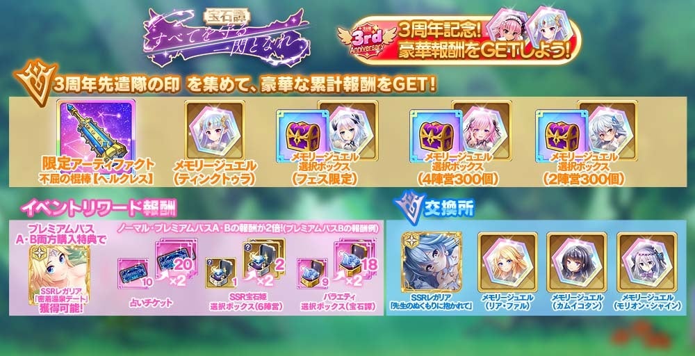 さらに3周年記念でイベントリワード報酬とエリア3周年の報酬が2倍になり、「占いチケット」や「SSR宝石姫選択ボックス(6陣営) 」がいつもの2倍獲得が可能となります。