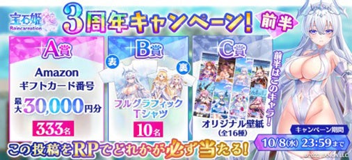 『宝石姫 Reincarnation』3周年を記念して、最大3万円分のAmazonギフトカード番号が合計333名に、オリジナルグッズ、オリジナル壁紙等が抽選で当たる超豪華なRPキャンペーンを開催!