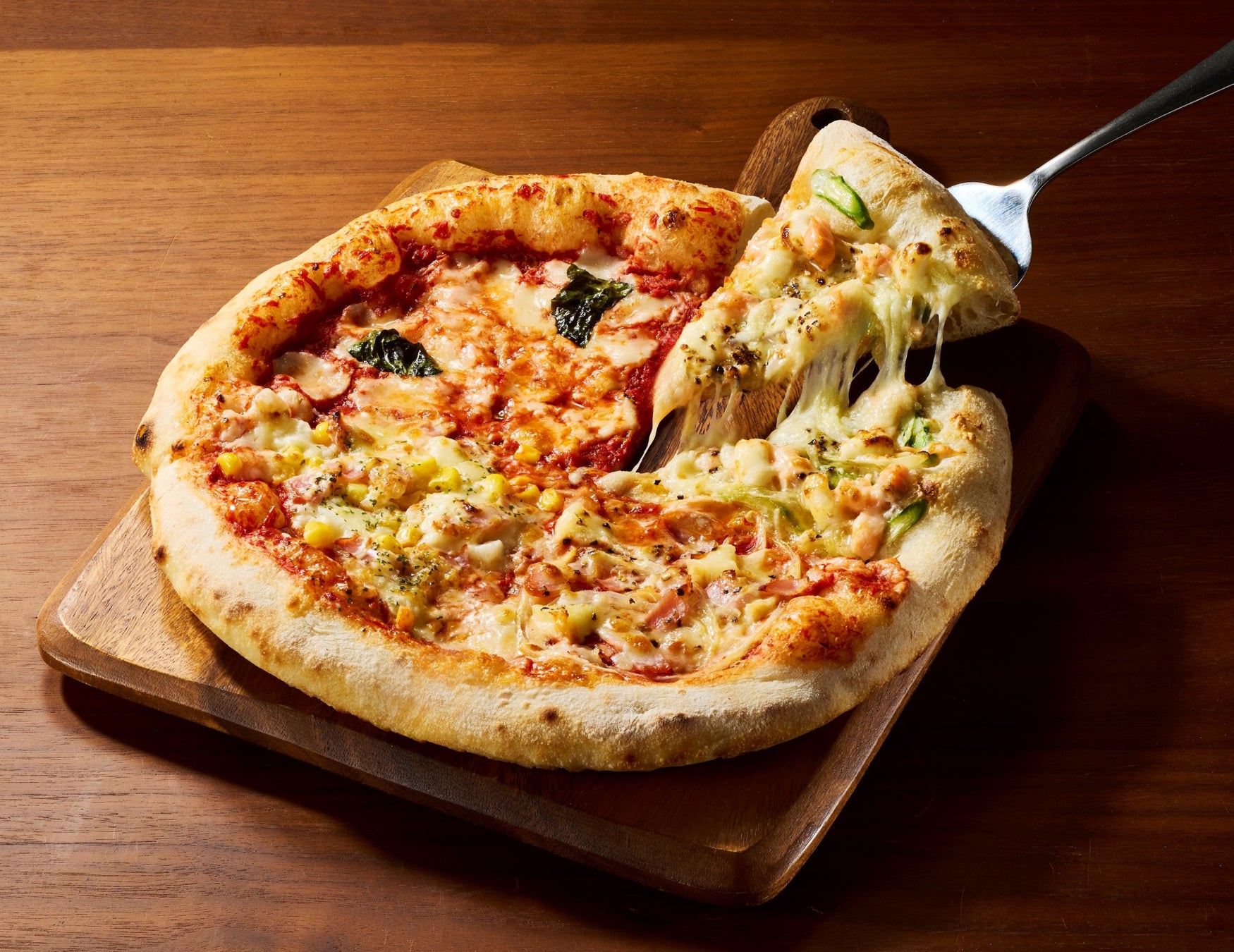 定番人気の「マルゲリータ」「ポテトベーコン」のほか、「サーモンとアスパラチーズ」「フランス産ブリーチーズとベーコン」のフレーバーの4つの味が1枚で楽しめるクワトロピッツァです。