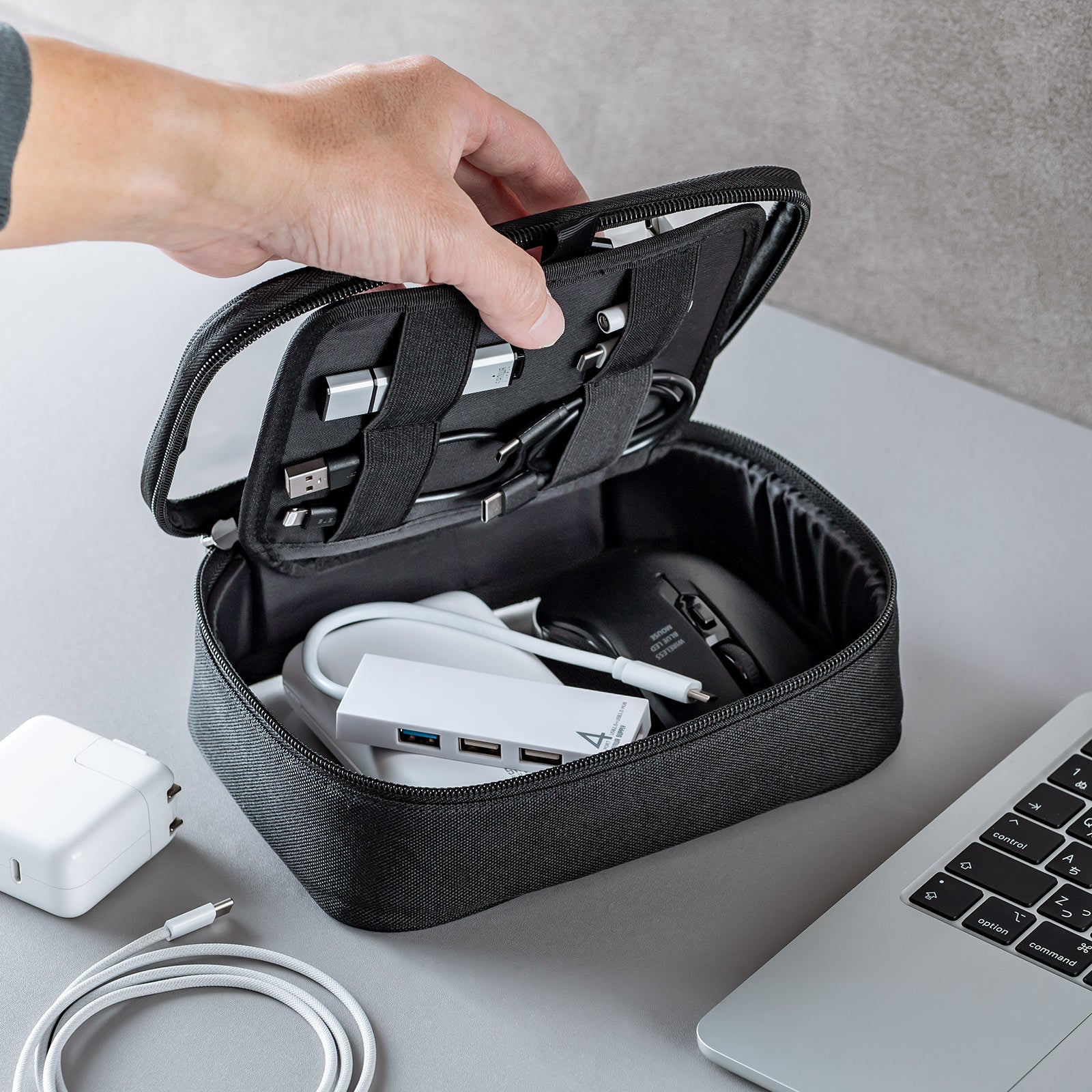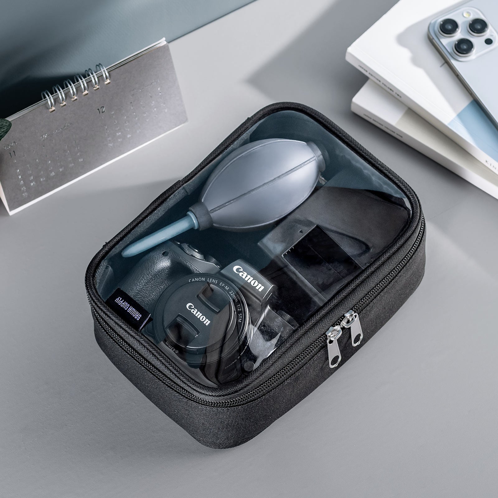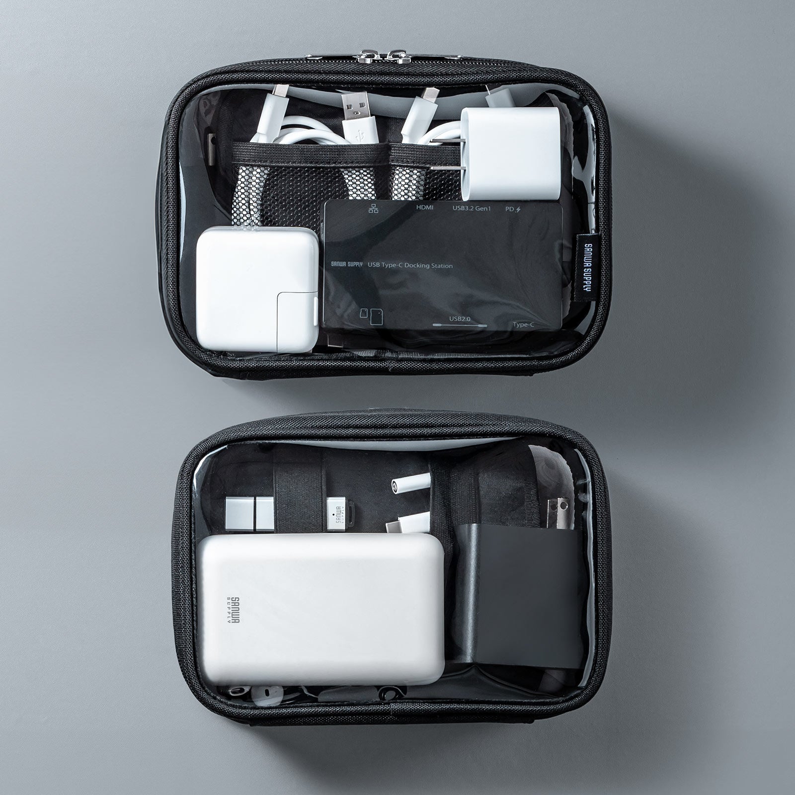 本製品はガジェット収納はもちろん、旅行や出張の小物整理にもおすすめです。たとえばカメラ用品、文具、衛生用品など、細かいアイテムを“見える状態でまとめる”のに最適。クリア素材だからこそ、忘れ物防止にも効果的です。