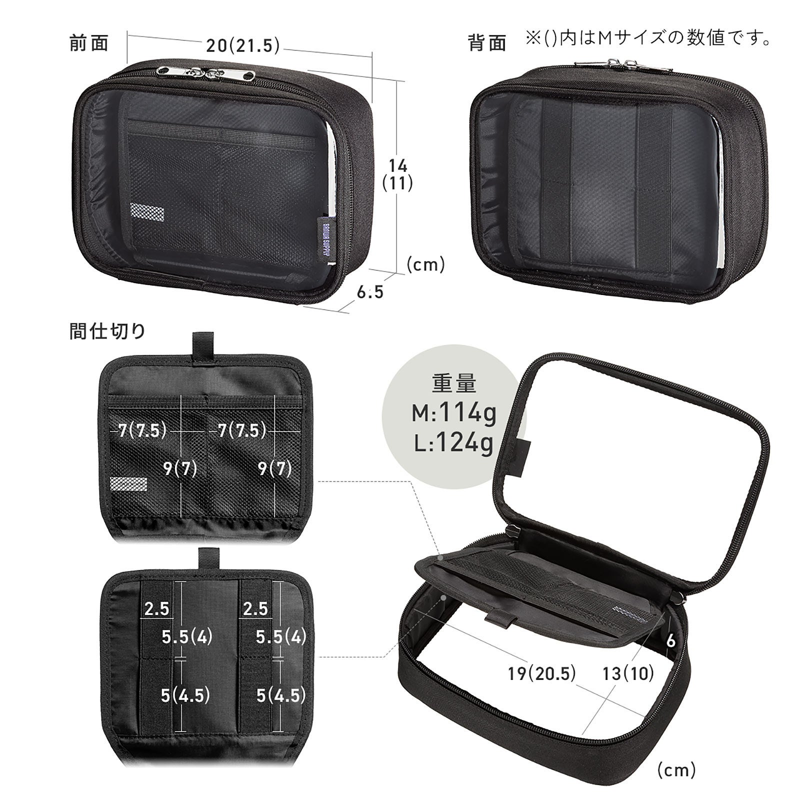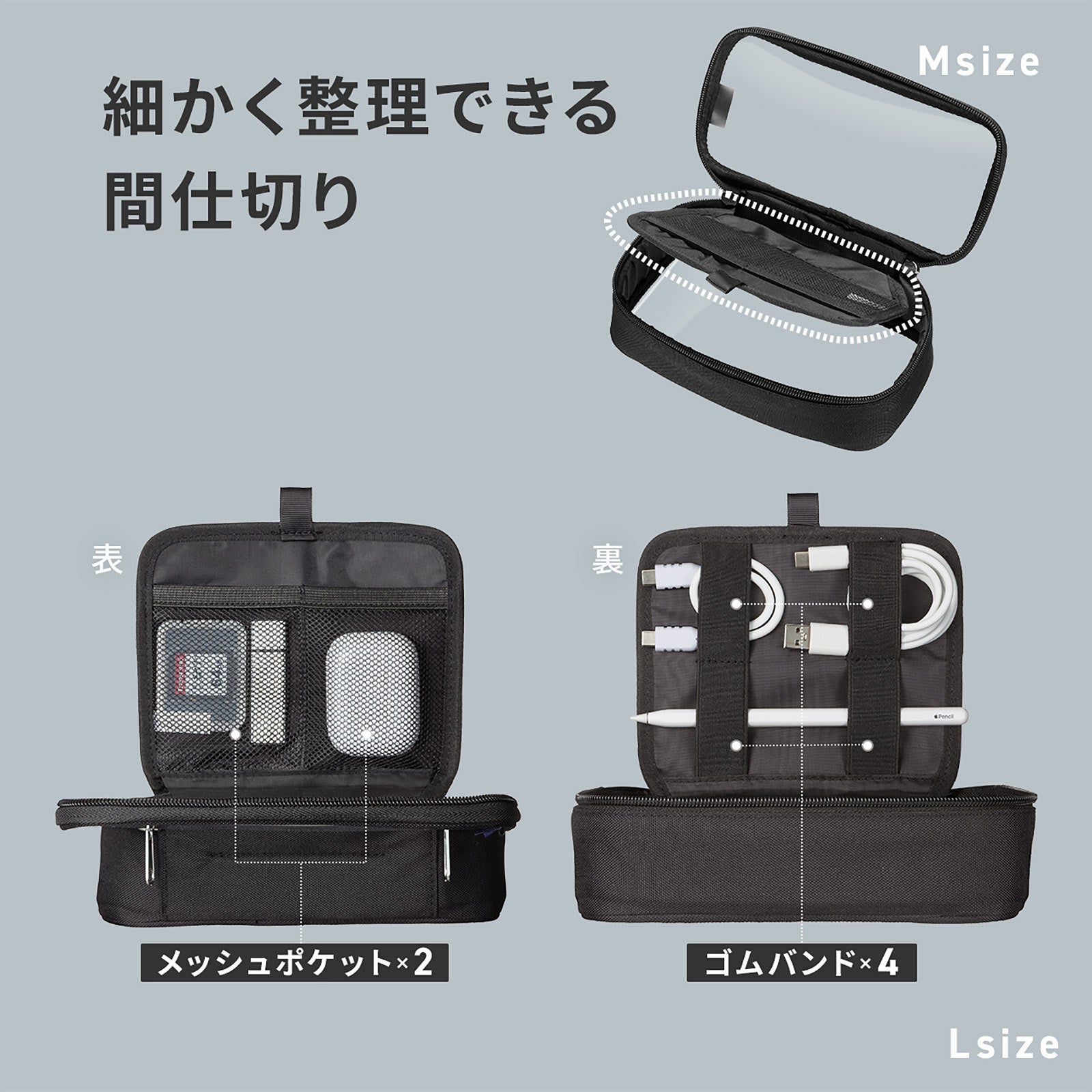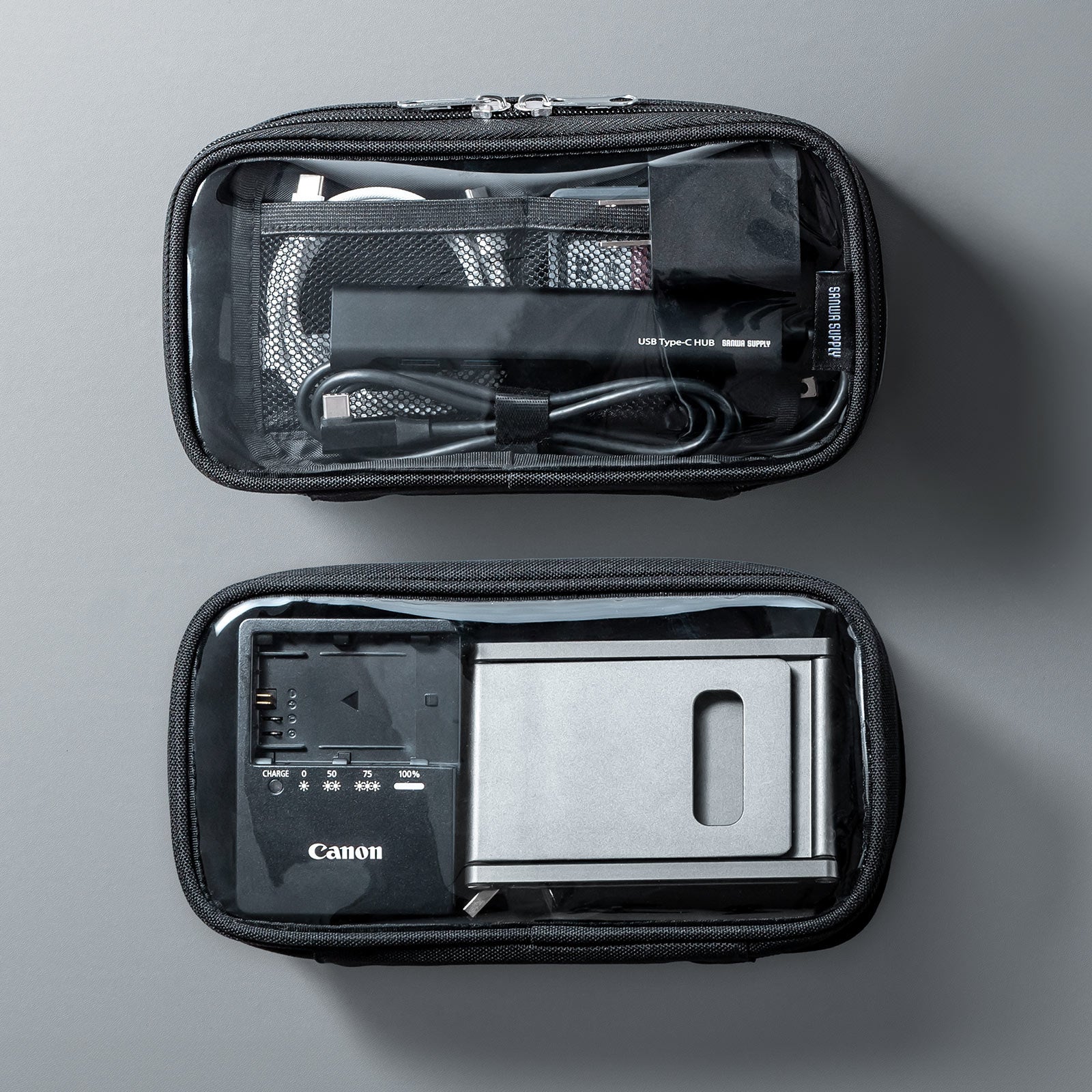 深さのある設計で、ACアダプタや大型バッテリー、マウスなど厚みのある機器もしっかり収納できます。ガジェット類は形状がバラバラで、薄型ポーチだと入らないことも多いですが、本製品なら安心。外出先で必要になる“ちょっと大きめ”の機器までまとめられるため、荷物を分散させず持ち運びの効率も上がります。サイズ違いで200-BAGIN039CLでMサイズ、200-BAGIN038CLでLサイズの展開です。
