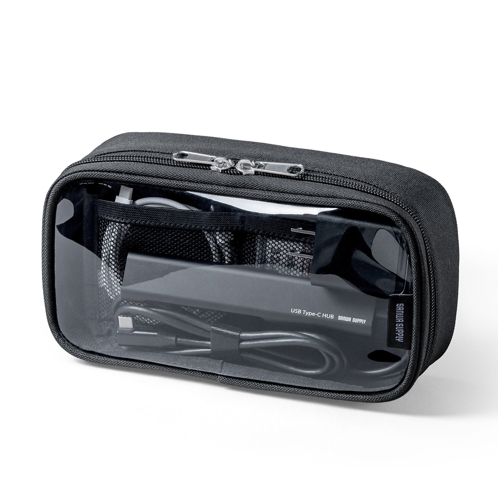 表裏ともに透明素材を採用したクリアポーチなので、どこに何が入っているかが一目で分かります。出先で「あれどこに入れた?」と探す時間を減らし、移動中や商談前の準備もスマートに。ガジェット収納にありがちな“迷子”を防ぐ設計です。