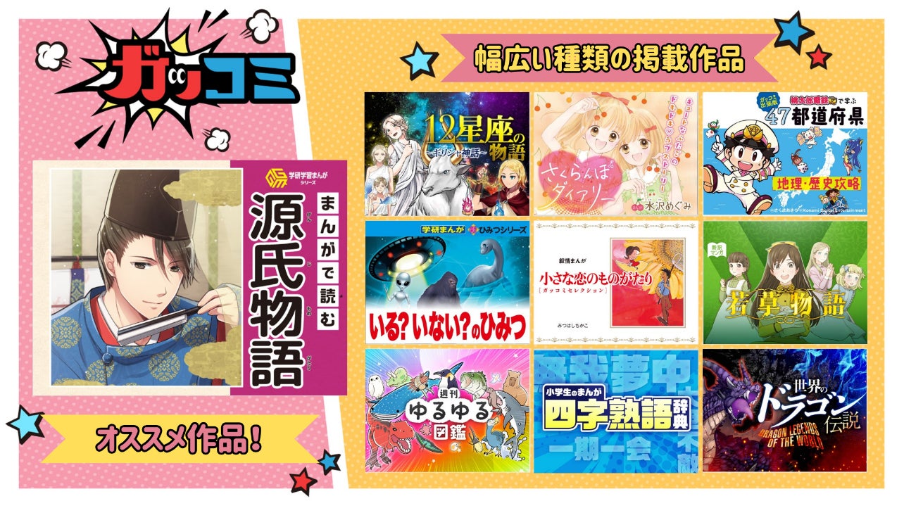 「ガッコミ」では、1月12日(金)から3月31日(日)までの間、歴史まんがや恋愛まんが、動物図鑑やまんが辞典など幅広く公開いたします。各作品の公開話数を通常時に比べ大幅に増やし、楽しんでいただけるようにしました。