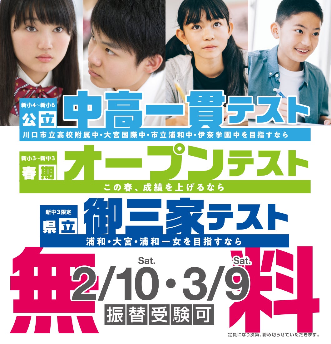 『春期オープンテスト』では、各学年に応じたレベルチェックのテストを実施するだけでなく、新小3~新小6生で川口市立高校附属中・大宮国際中・伊奈学園中を目指すなら『公立中高一貫テスト』、県立浦和高校・大宮高校・浦和一女高校を目指すなら『県立御三家テスト』を受験することが可能です。同じ志望校を目指すライバルたちと比較し、どの程度の得点力があるのかを測定します。