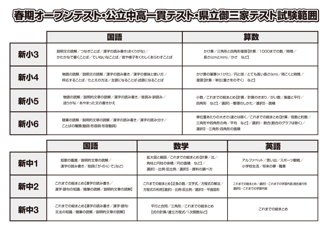 出題範囲 学年ごとに時間帯・テストの出題範囲が決まっています。