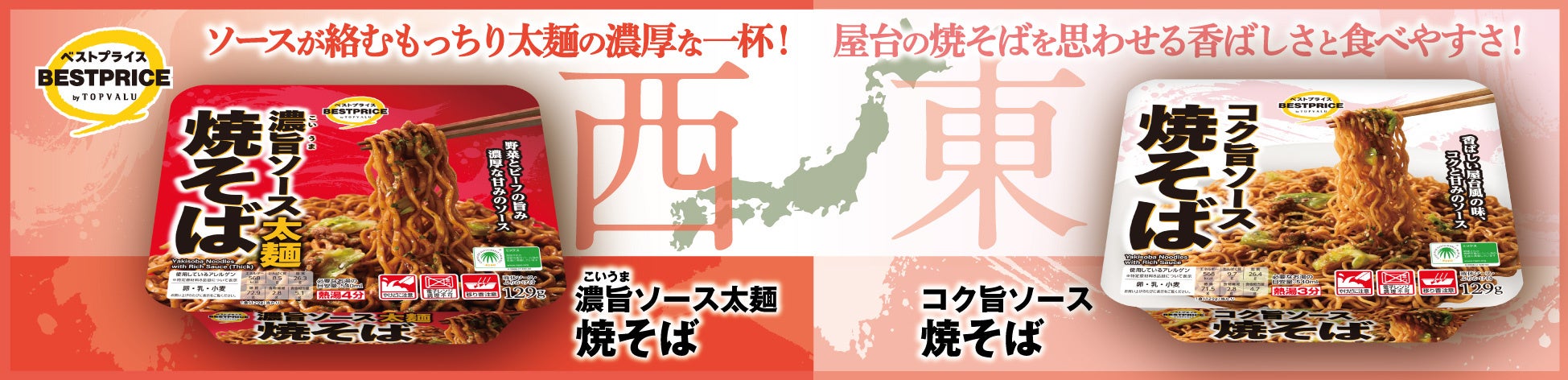 イオンは5月5日より順次※1、「イオン」「イオンスタイル」「マックスバリュ」など全国約5,800店舗※2で、トップバリュベストプライスのカップ焼そばを、東日本・西日本エリア※3別に味や仕様をアップデートし、リニューアル発売します。