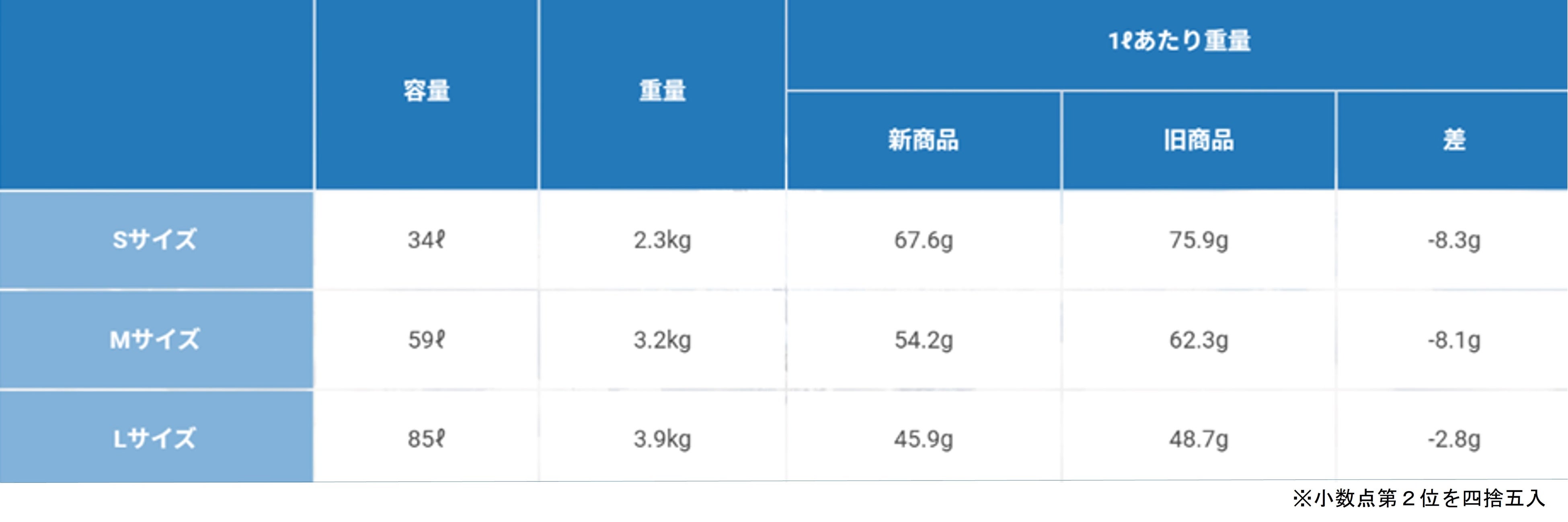 旧トップバリュ軽量ジッパーキャリーと比較すると、容量が増え、1Lあたりの軽量化を実現しています。