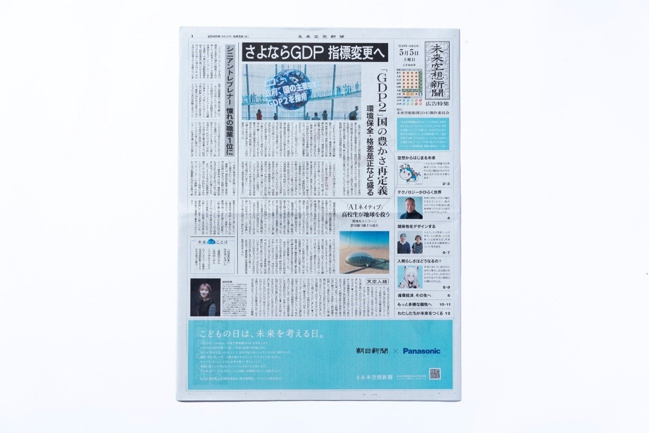 「未来空想新聞2040」は、パナソニックと朝日新聞社の企画のもと、“こどもの日は、未来を考える日。”というメッセージを込めて2023年5月5日に発行したものです。未来を想う著名人や有識者の方々の2040年の空想を、寄稿や取材記事として掲載しました。読み手を圧倒する大規模な展開と、未来を見据えたメッセージ性が評価され、今回の受賞に至りました。
