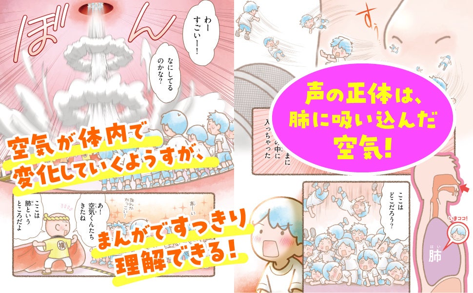 『絵本 うたうからだのふしぎ』では、空気を主人公としたまんがで、話すときやうたうときにからだの中でいったいなにが起きているのかを楽しく学べます。