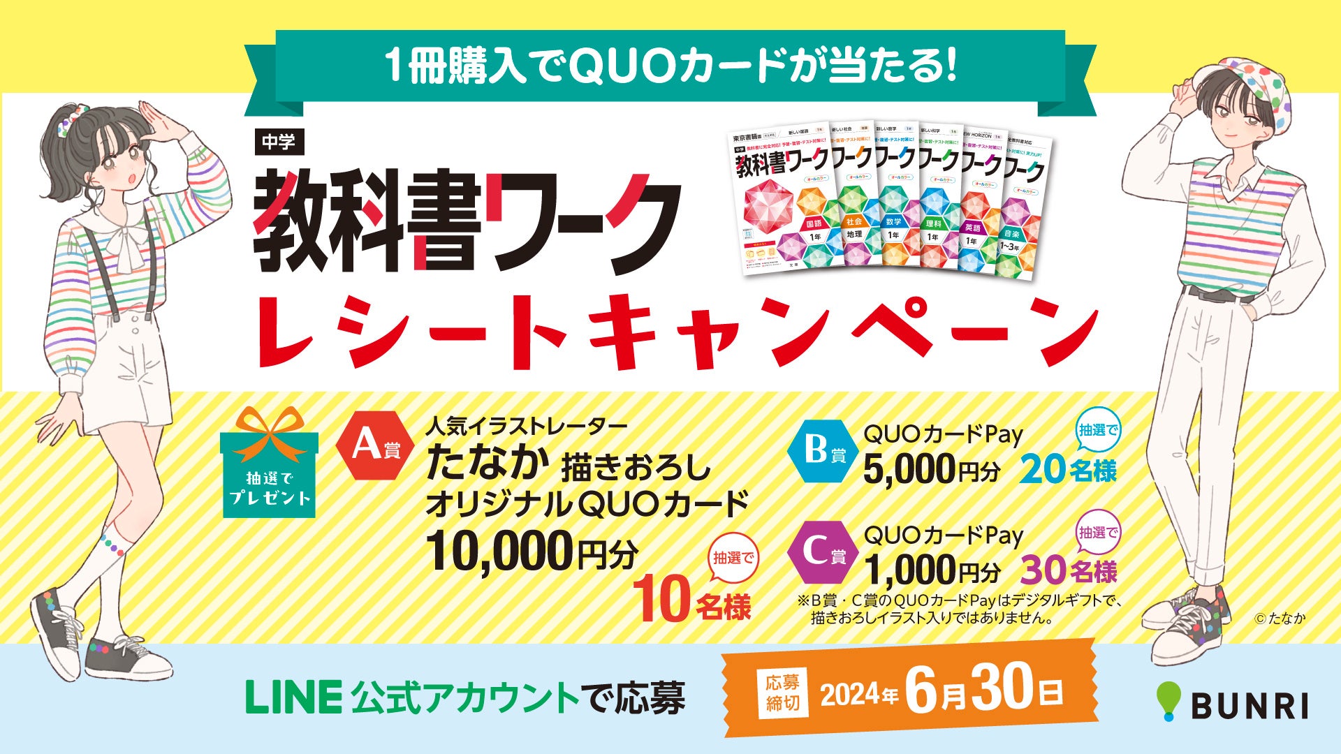 教科書に完全対応した準拠版ワーク「中学教科書ワーク」をご購入いただいた方の中から、抽選で10名様に人気イラストレーターたなか描きおろしのオリジナルQUOカード10,000円分をプレゼントいたします。