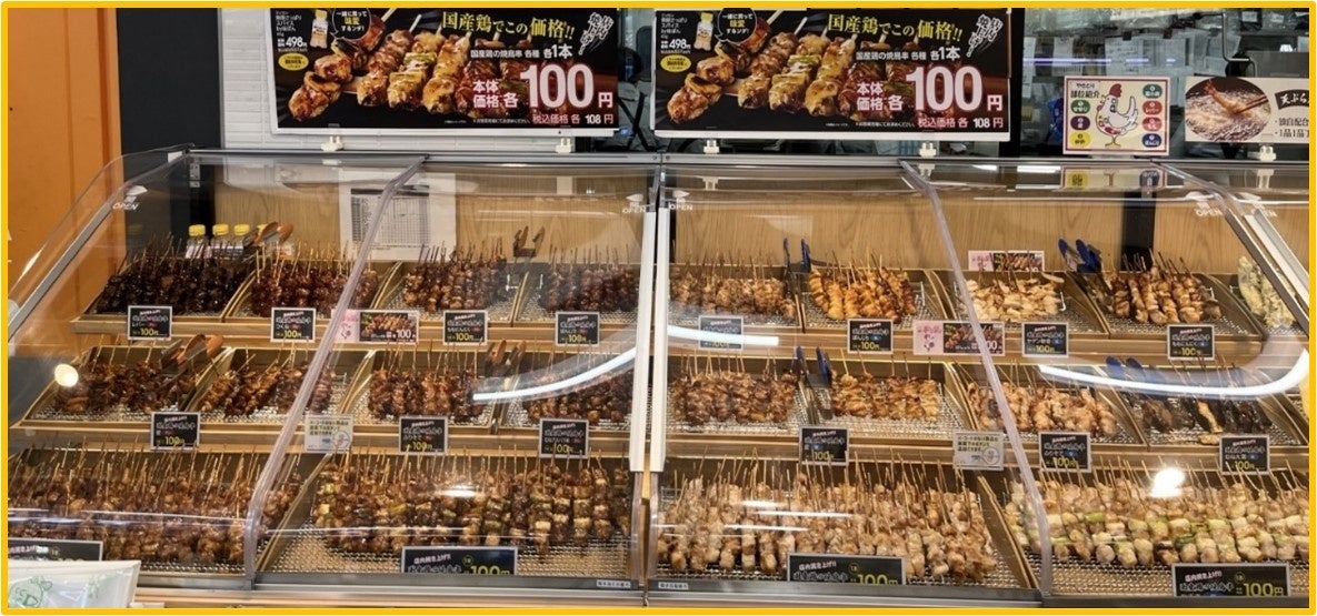 バラ売り実施店舗では、もも・ねぎまなどの定番串に加えて、ぼんじり・ふりそでといった部位や、むね大葉・ももにんにくなどのバラエティ豊かな串も展開しています。定番から個性のある串まで幅広く用意することで、焼鳥カテゴリー全体の魅力を高め、繰り返し訪れても楽しめる売場づくりを進めています。