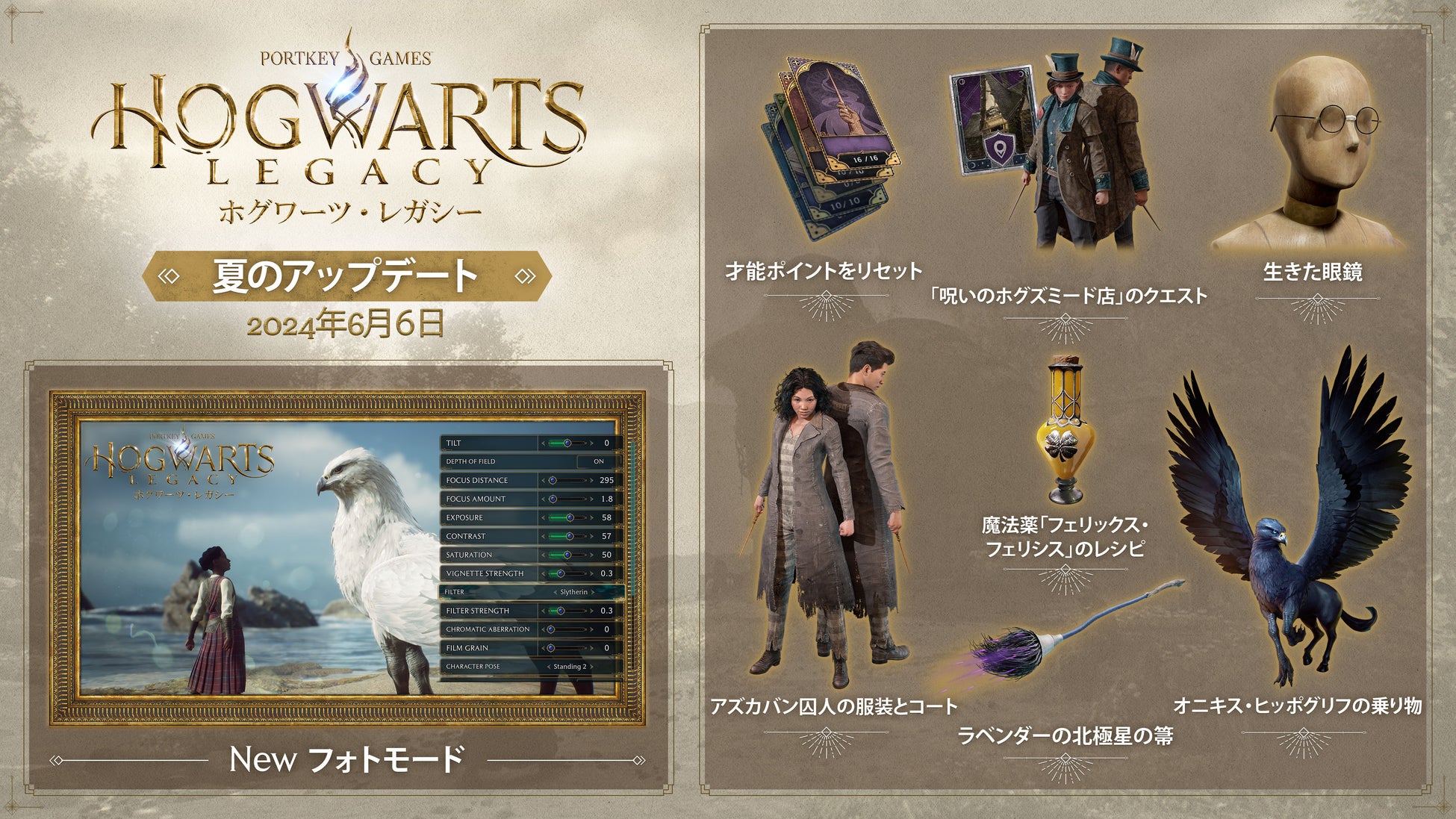 2024年6月6日(木)より配信を開始したアップデートを適用することで、フォトモードの追加などさまざまな機能拡張やコンテンツが追加されます。また、クエスト「呪いのホグズミード店」をクリアすることで、報酬として自分のホグズミードの店をもつことができ、「店主の装飾品セット」を受け取ることができます。ぜひチャレンジしてみてください。
