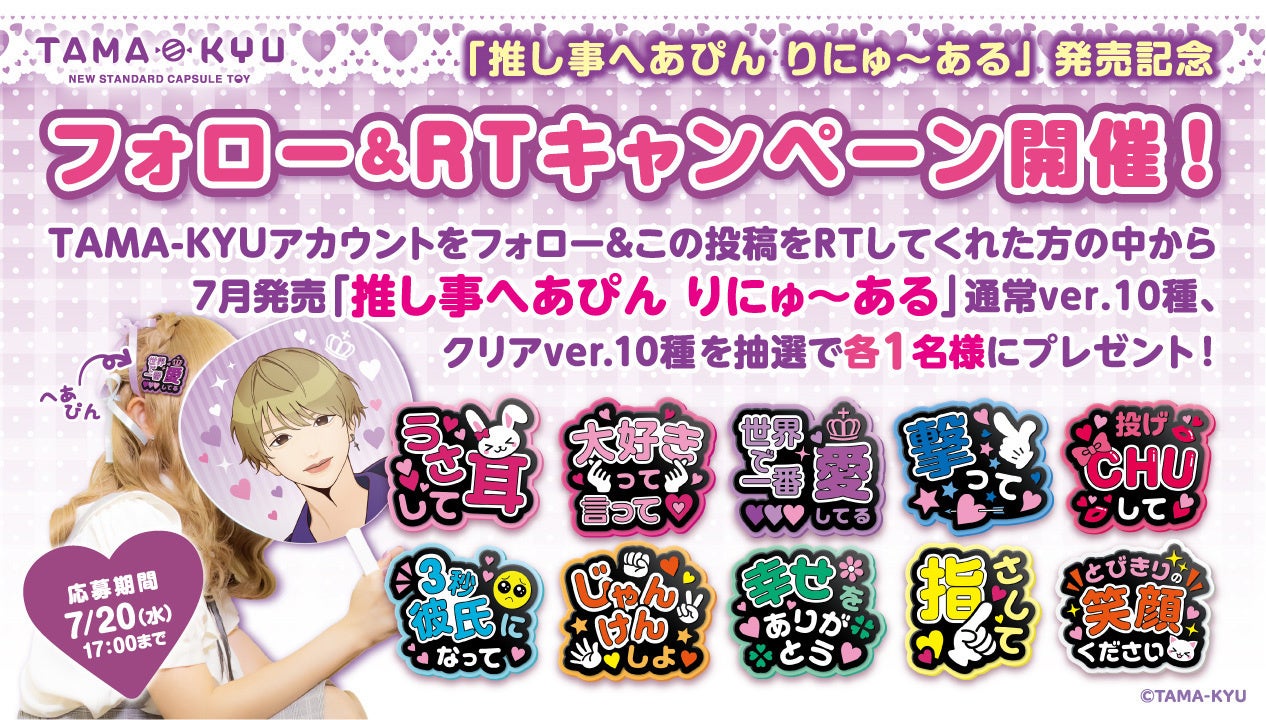 株式会社ブシロード(本社:東京都中野区、代表取締役社長:木谷高明)のグループ会社にあたる株式会社ブシロードクリエイティブ(本社:東京都中野区、代表取締役社⻑:成⽥耕祐)は、オリジナルカプセルトイブランド『TAMA-KYU(たまきゅう)』から「推し事へあぴん りにゅ~ある」 を全国のカプセルトイコーナーにて2022年7月13日(水)より順次販売を開始いたします。