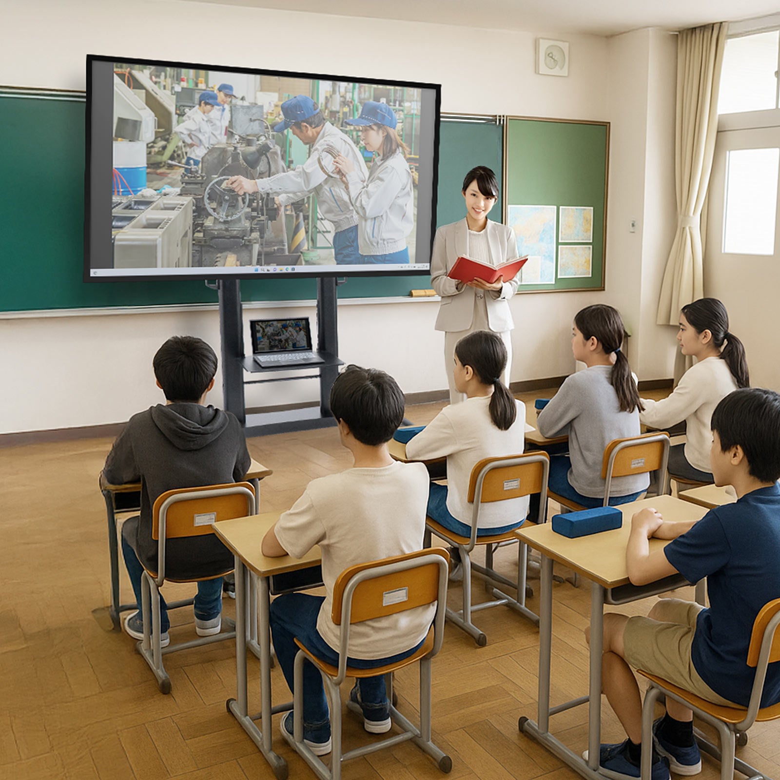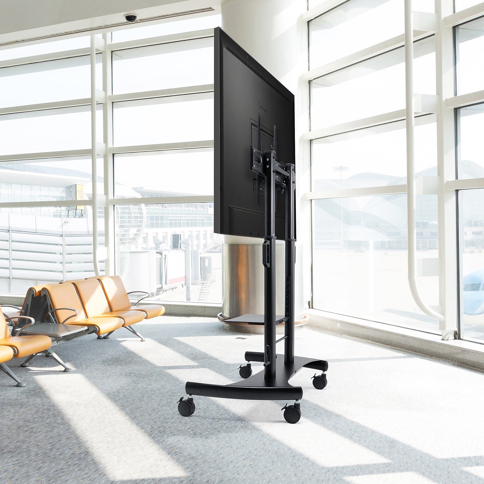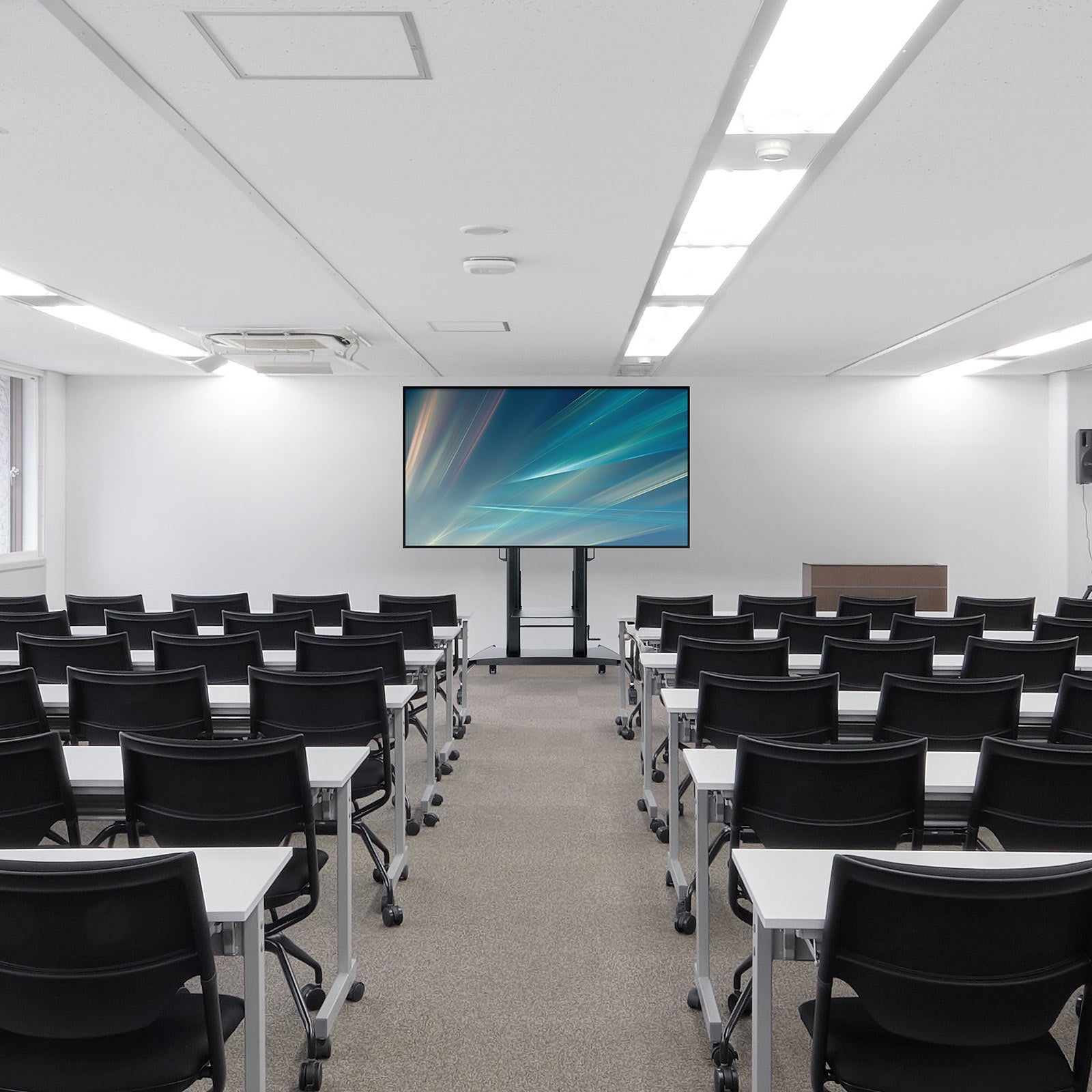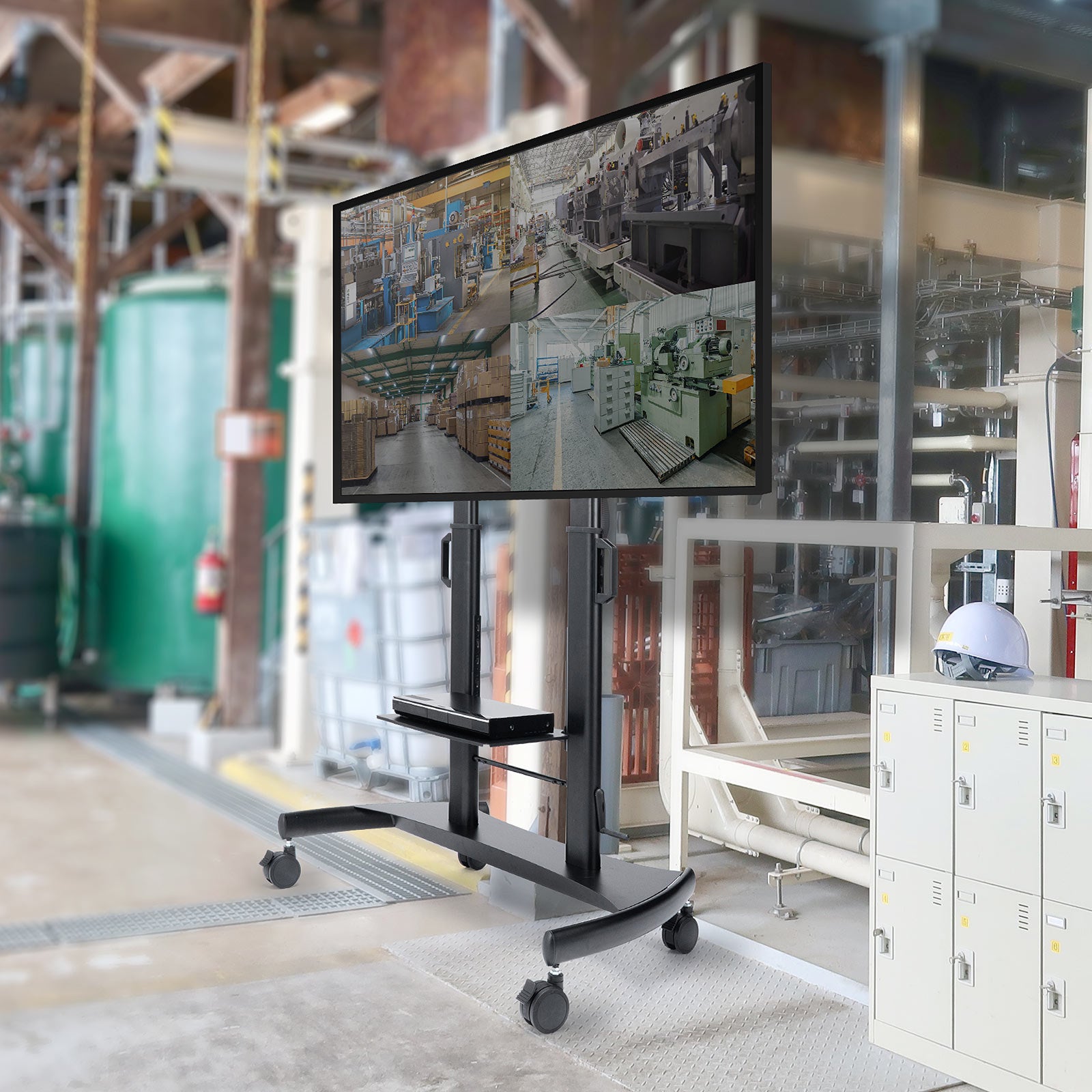 60〜100インチクラスの大型ディスプレイに対応し、最大100kgまで支える高耐荷重設計を採用しています。フレームにはスチール素材を使用し、重量級ディスプレイでもたわみや揺れを抑えた安定した設置が可能です。大型ディスプレイの導入に不安を感じていた会議室や商業施設、教育現場でも、安心して活用できます。