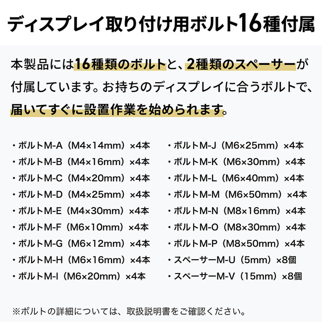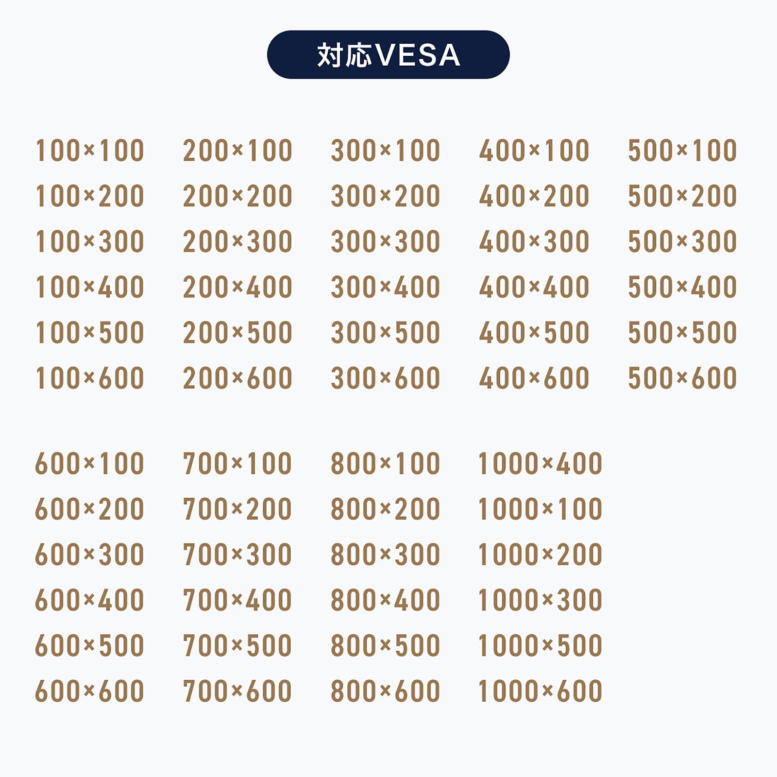 VESA100×100から最大1000×600までの幅広い規格に対応し、メーカーや機種を問わず多くのディスプレイと組み合わせ可能です。将来的なディスプレイ入れ替え時にもスタンドをそのまま活用でき、設備投資の無駄を抑えられます。企業や施設での長期運用を見据えた設計です。