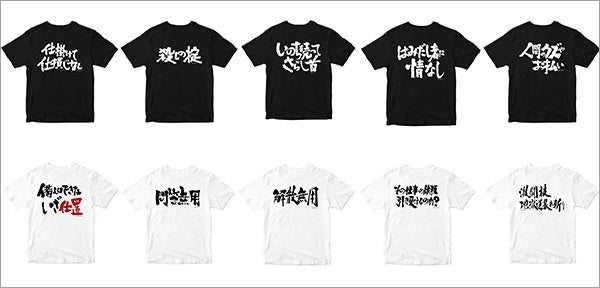 タイプ:『必殺仕掛人』「仕掛けて仕損じなし」Tシャツ、『必殺仕掛人』「殺しの掟」Tシャツ、『必殺仕置人』「いのちを売ってさらし首」Tシャツ、『必殺仕置人』「はみだし者に情なし」Tシャツ、『必殺仕置人』「人間のクズやお払い」Tシャツ、『必殺仕置人』「備えはできたいざ仕置」Tシャツ、『新必殺仕置人』「問答無用」Tシャツ、『新必殺仕置人』「解散無用」Tシャツ、『必殺仕事人』「その仕事の依頼引き受けるのか?」Tシャツ、『必殺仕事人』「激闘技地獄道暴れ斬り」Tシャツ