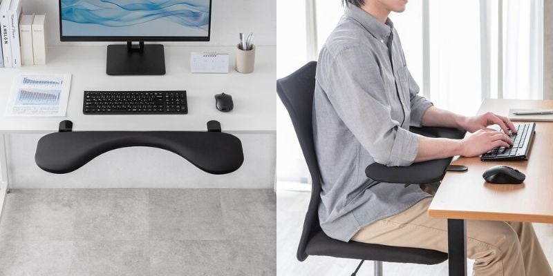 肘を自然に置ける位置に支えを設けることで、肩や肘が上がりすぎるのを防ぎます。さらに、キーボード操作時に前のめりになりがちな姿勢を抑え、無理のないポジションを保てます。