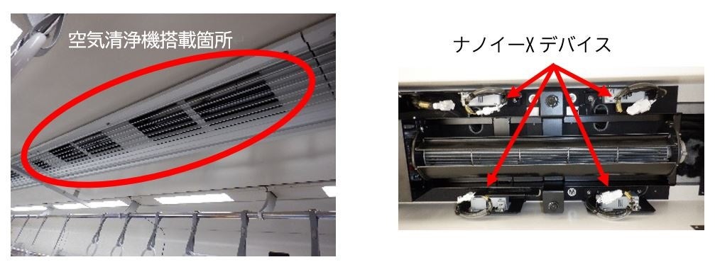 鉄道車両は、ドアの開閉や人の出入りも頻繁で、細長く広い空間といった特異な環境のため、ナノイーの効果を最大限に発揮させるためには、車両内で均一に広がるような制御が必要です。そこで、JR東日本テクノロジーとパナソニックは共に検討を重ねて、鉄道車両に最適化。JR東日本テクノロジーが、パナソニックのナノイーXデバイスに制御電源装置を組み込んで製品化しました。今回の阪急電鉄の採用により、鉄道車両におけるナノイーの採用は、全16社になります。