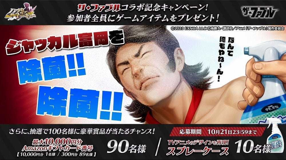 『ザ・ファブル』とのコラボレーションを記念して、参加者全員がゲーム内アイテムがもらえるシリアルコードを獲得できるキャンペーンを実施中です。さらに抽選で10名様に、TVアニメに登場した「ジャッカル除菌スプレー」を再現したスプレーボトル、抽選で90名様にAmazonギフトカード番号が当たるキャンペーンを実施しております。