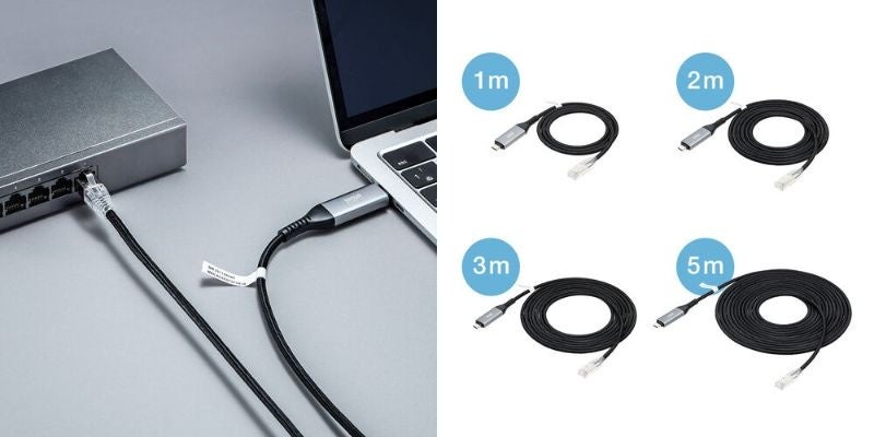 USB Type-CポートをLAN(RJ-45)ポートへ変換できるケーブルです。変換アダプタを別途用意する必要がなく、ケーブル1本でスマートに有線接続が可能。LANポート非搭載のノートPCや薄型モバイルPCでも、オフィスや自宅の有線ネットワークにすぐ接続できます。デスク周りもすっきりし、持ち運び用としても便利です。