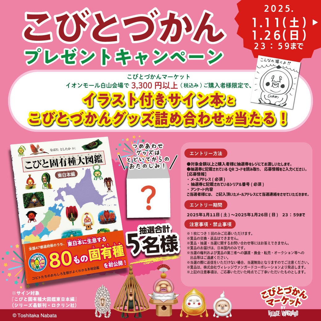 株式会社ヴィレッジヴァンガードコーポレーション(所在地:愛知県名古屋市、代表取締役社長:白川篤典)は、「こびとづかん」のイベント体験型POP UP「こびとづかん マーケット」において、1月11日(土)からのイオンモール白山での開催において、プレゼントキャンペーンを実施いたします。