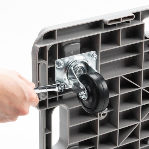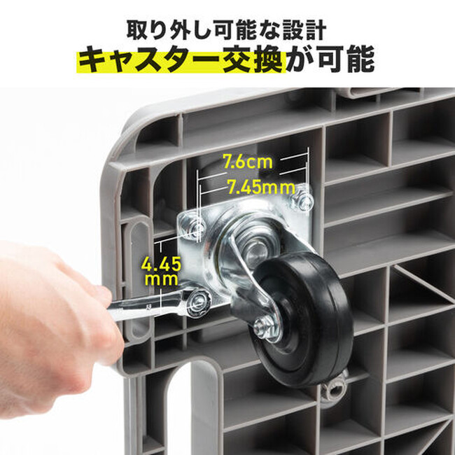 本体重量は約3.5kgと軽量ながら、高強度のPP素材を使用した荷台により、1台あたり約150kgまでの荷物を積載可能です。家庭での飲料ケースの移動やゴミ出しはもちろん、倉庫や店舗、オフィスでの重量物の運搬まで、幅広いシーンで活躍します。