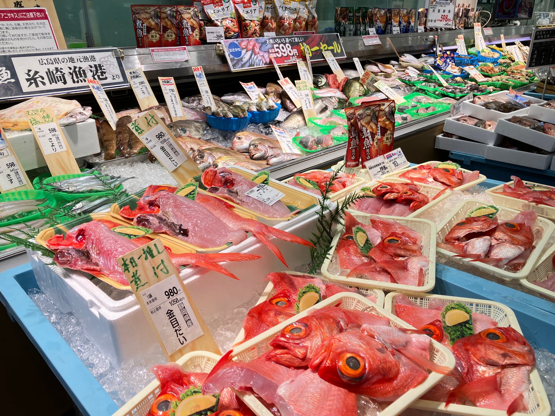お魚売場では、対面鮮魚コーナーにて、今が旬のお魚を、毎日展開いたします。三原市糸崎漁港や江田島市鹿川漁港直送の「地どれ鮮魚」を曜日限定で展開するほか、全国の産地から仕入れた旬の鮮魚を、最適な食べ方でご提案します。また、仕入れた鮮魚などを、店内加工しご提供する「魚魚炎(ととえん)」を新規導入し、焼き魚や煮魚、お弁当などを取りそろえます。