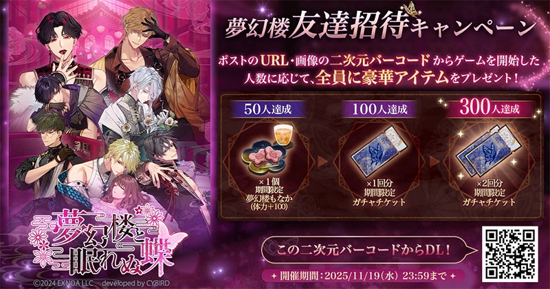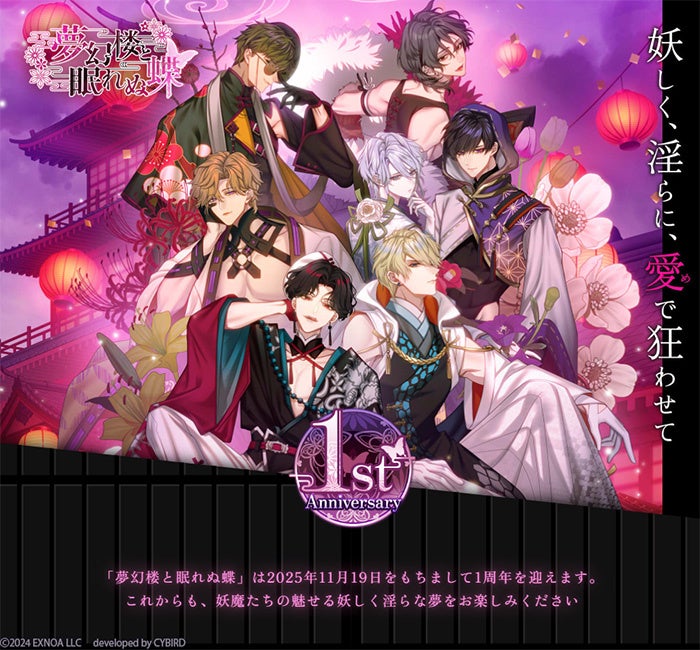 DMM GAMESを運営する合同会社EXNOA(本社:東京都港区、CEO:東條 寛、URL:https://games.dmm.com/)は、Romanteen18シリーズの第1弾・オトナの女性向け恋愛ゲーム「夢幻楼と眠れぬ蝶」にて、2025年11月19日(水)の1周年に向けた特設サイトの公開や、1周年記念PVの公開をお知らせいたします。また、ウエハラ蜂先生デザインの新衣装「1周年記念カードガチャ」の開催もお知らせいたします。