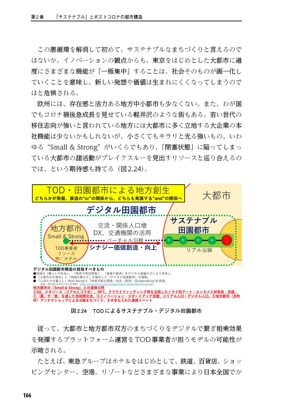 本書のキーワードはTOD、サステナブル、田園都市です。TODはTransit-Oriented Developmentの略で、鉄道をはじめとした公共交通に根差した都市開発やまちづくりを意味します。1990年代、米国の都市計画家ピーター・カルソープにより提唱された理念で、より健全で持続可能なコミュニティへと導く上で不可欠とされ、今、世界中で注目されている考え方です。本書では、TODによる田園都市開発の先駆者たる東急のまちづくりの経緯と特徴を振り返り、合わせてポストコロナの時代の変化や、昨今高まりつつある「サステナブル」意識を踏まえ、今後のビジョン・可能性について展望します。