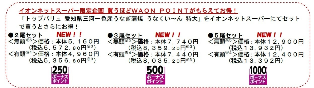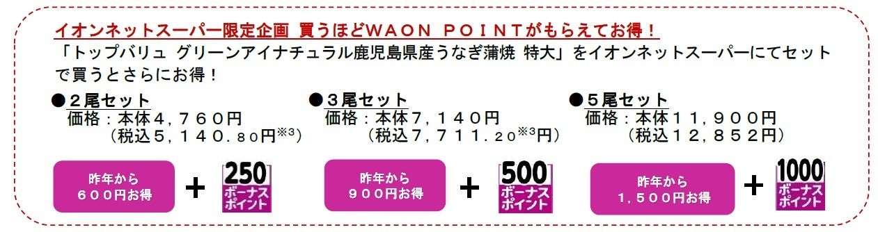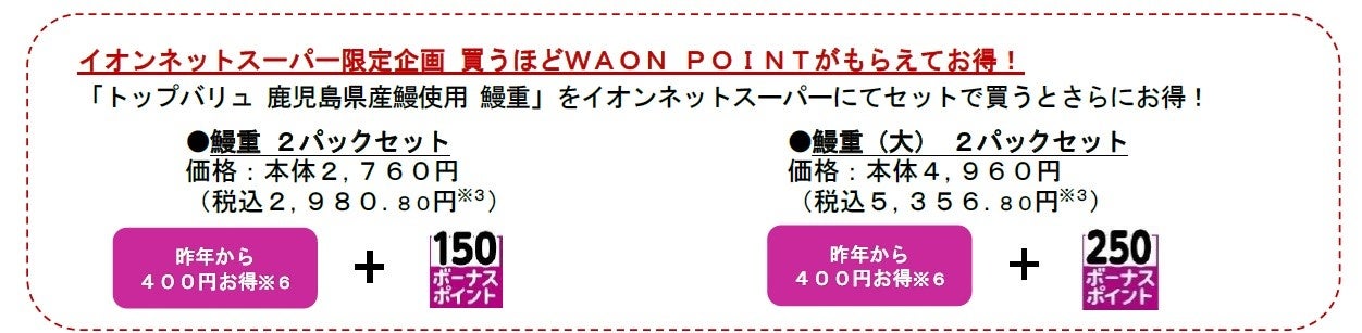 昨年のシラスウナギの豊漁を受け、当社では、本年のうなぎの価格を見直し、お値打ち価格で提供します。一例として、“複数人でシェアできる”“コスパが良い”と好評いただいている当社の代表的な商品「トップバリュ グリーンアイナチュラル 鹿児島県産うなぎ蒲焼 特大」の予約価格を昨年より300円お得な本体価格2,380円で提供します。また、イオンネットスーパー限定で、昨年より最大1,500円お得かつ、最大1,000WAON POINTが付与されるセットで買えば買うほどお得な企画も実施します。