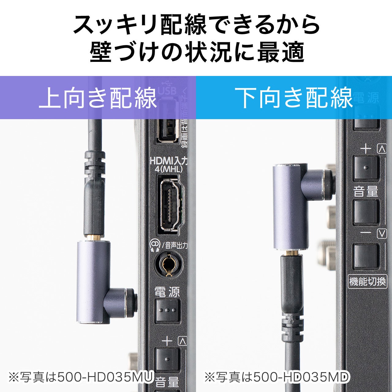 上向き(500-HD035MU)・下向き(500-HD035MD)は、テレビ背面や壁掛け設置などの限られたスペースでも配線方向をコントロールできるのが強みです。ケーブルを無理に曲げずに取り回せるため、端子やケーブルの折れ曲がり・負担を軽減。壁掛け金具やテレビスタンドとの干渉を避けやすく、見た目もスッキリ整います。狭所での接続作業がラクになり、設置後の安心感も高まります。