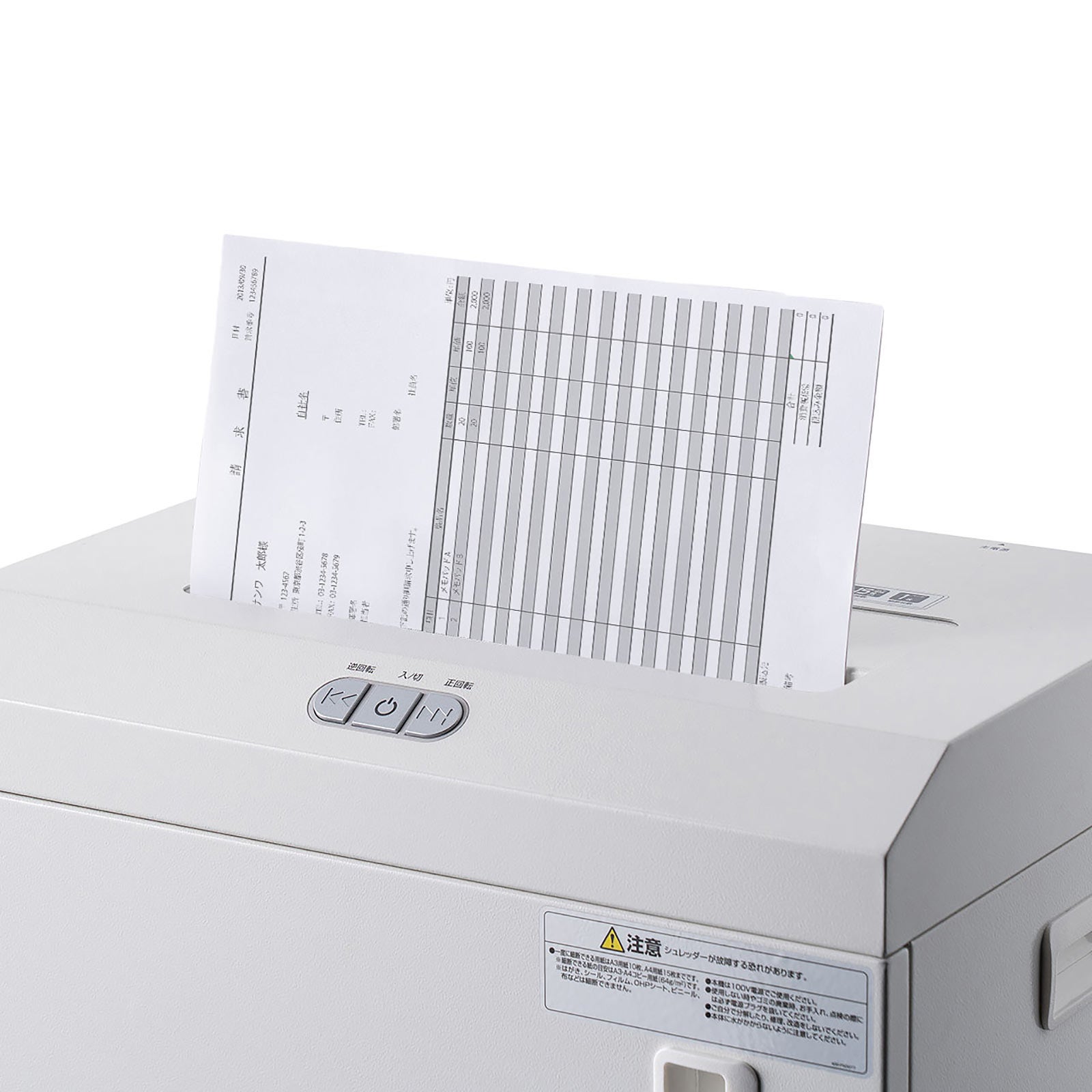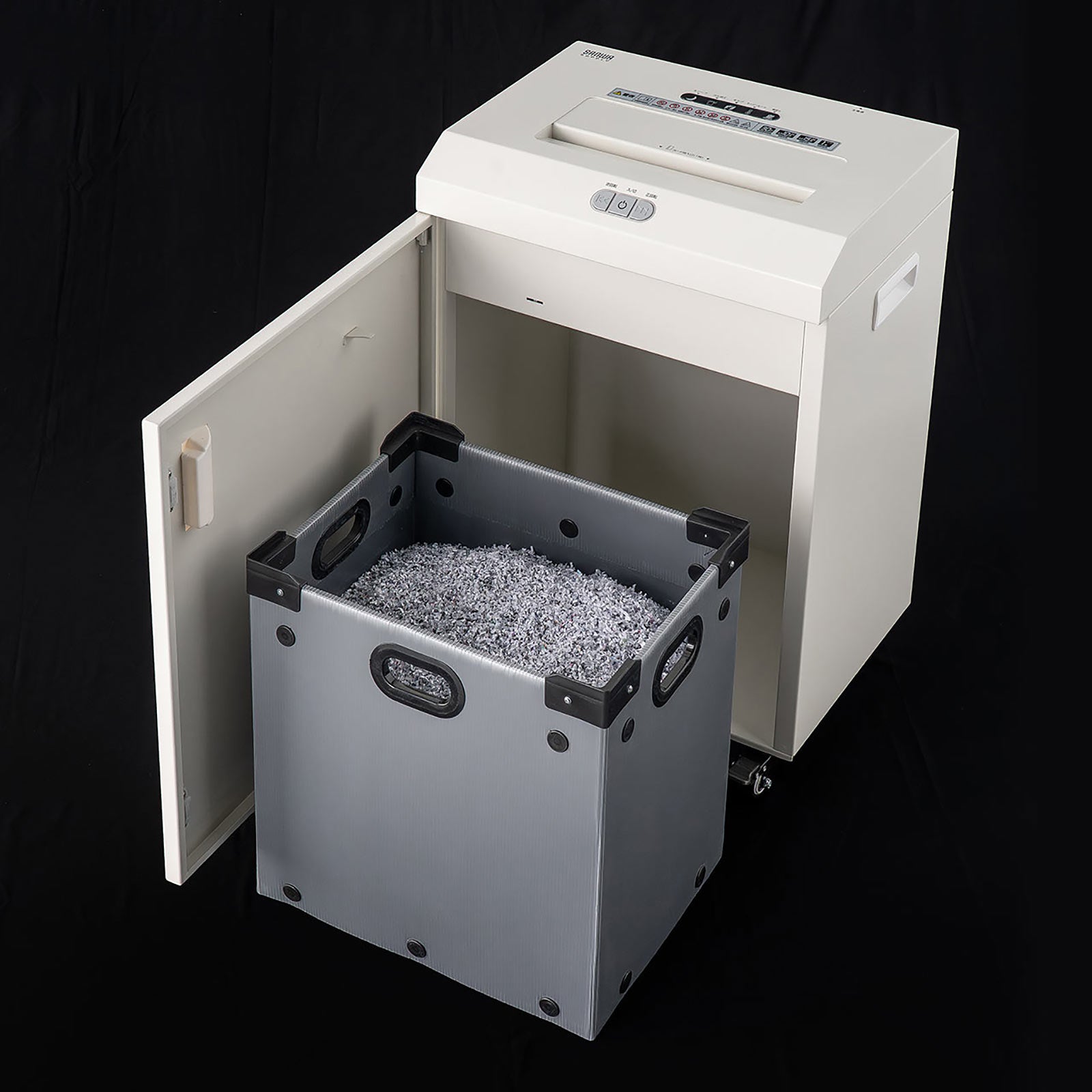 本製品はA3対応のワイド設計。投入幅31cmで、A3用紙を折ることなくそのまま細断できます。図面や設計資料、販促ポスターなど、大判書類を扱うオフィスでもストレスなく処理が可能。書類を折る手間が省けることで業務効率が向上し、日々の作業時間短縮にも貢献します。