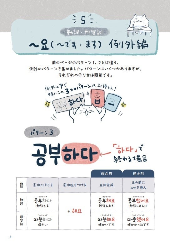 別冊では韓国語の初級文法の大切なところを、ぎゅぎゅっとコンパクトにまとめて整理しています。イラストたっぷりオールカラーの楽しい紙面です。