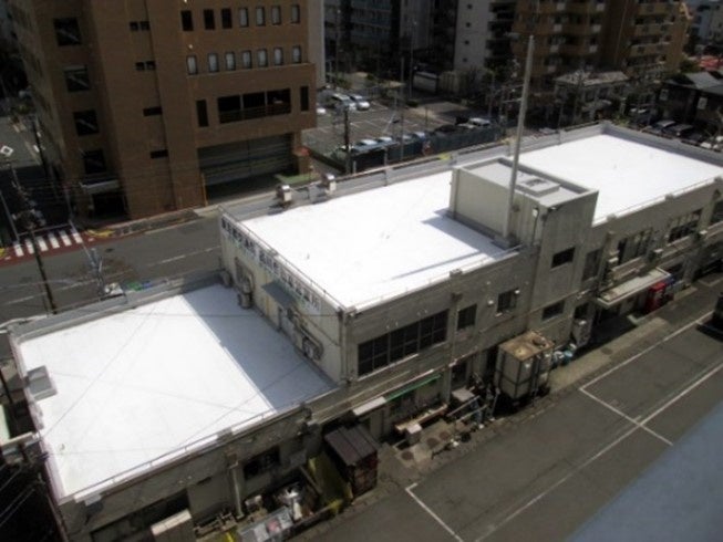 SPACECOOL防水シート(現:イノベーションプルーフRR)を自動車営業所屋上に施工し、放射冷却素材の効果により直射日光からの建物の温度上昇を抑えることで、営業所で使用する電力を低減できるかを検証しました。