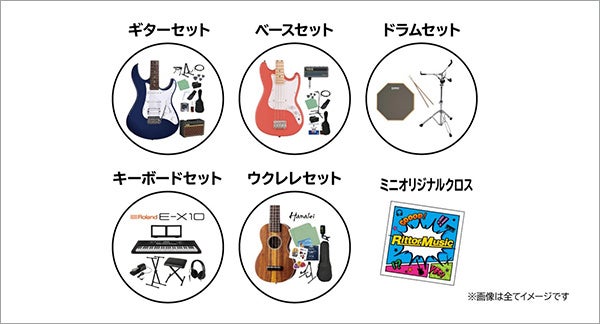 抽選で2名様に、ギター/ベース/ドラム/ウクレレ/キーボードいずれかのビギナーズセットをプレゼント